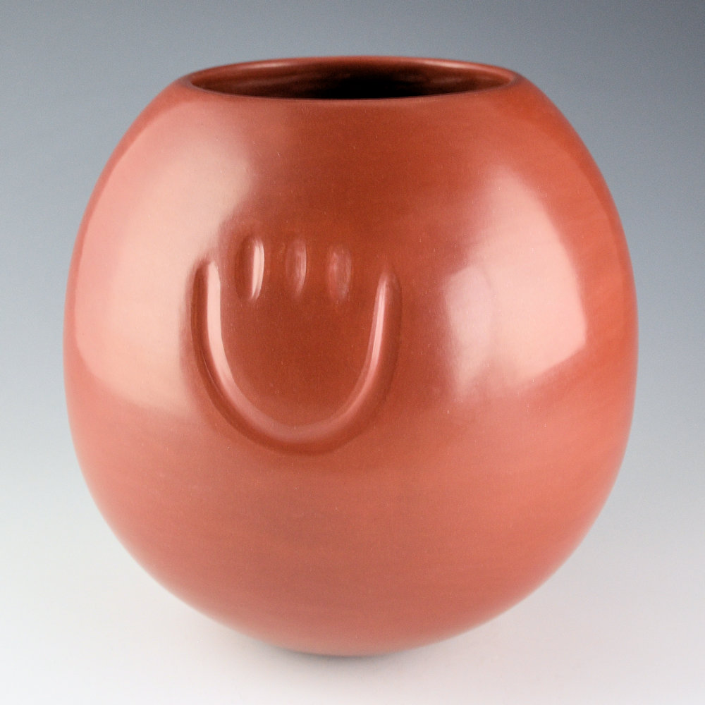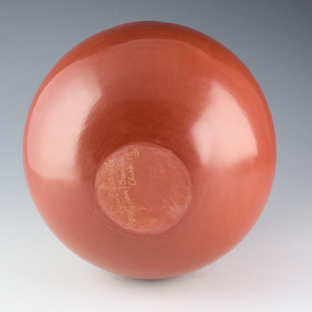 Tina Garcia was well known for her focus on traditional shapes and plainware Santa Clara pottery. This jar has rounded sides in the style of a storage jar. There are three bear paws impressed into the clay before it was stone polished. The Bear Paw is part of a story where a bear led the Pueblo people to water during a drought. The was fully polished to a high shine and then traditionally fired a deep red coloration. It is signed on the bottom in the clay, “Tina Garcia”. It is in excellent condition with no chips, cracks, restoration, or repair.
