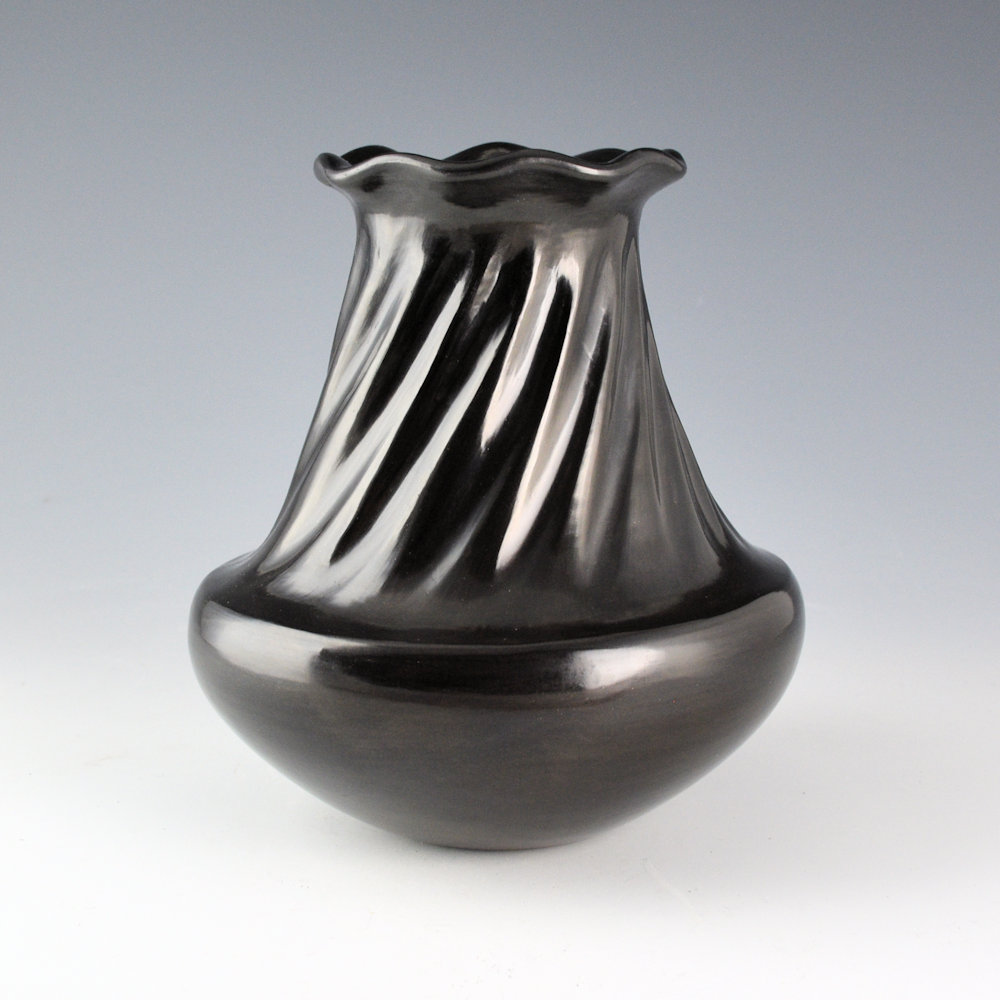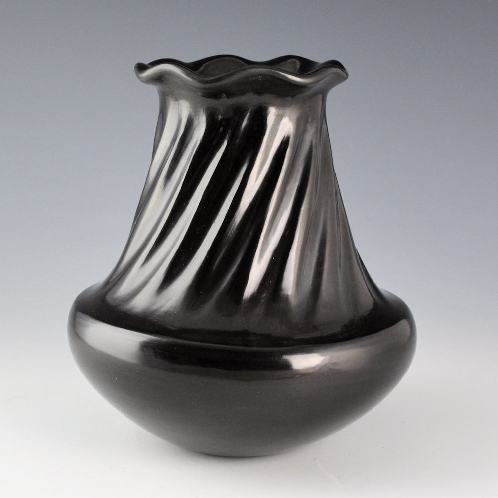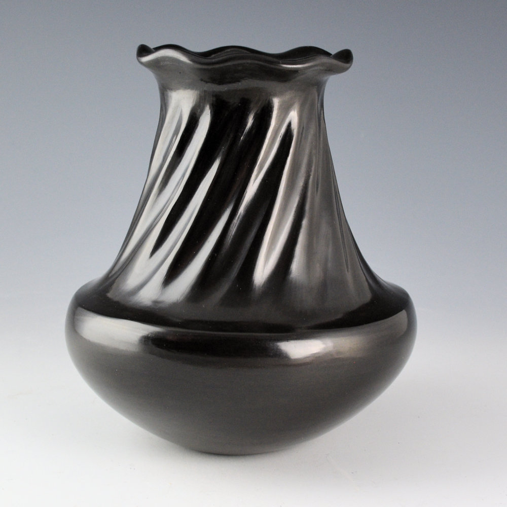 Tina Garcia was well known for her focus on traditional shape and plainware Santa Clara pottery. This water jar has a sharp shoulder that slightly indents before it extends to the rim. The neck has 16 swirling melon ribs carved into the clay. The rim of the jar is undulating, in the classic “raindrop rim” style. The entire piece is fully polished and fired to a glassy black. It is signed on the bottom in the clay, “Tina Garcia”. It is in excellent condition with no chips, cracks, restoration, or repair.