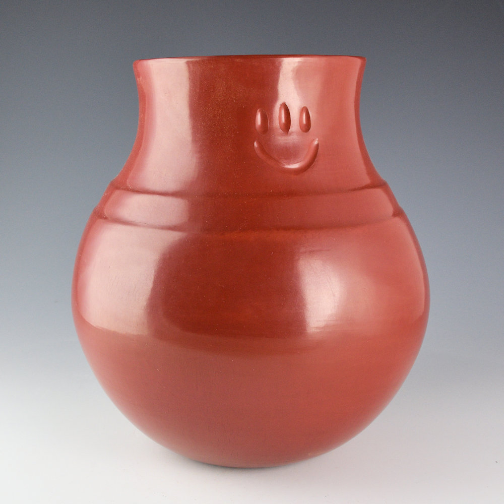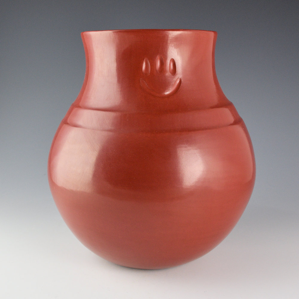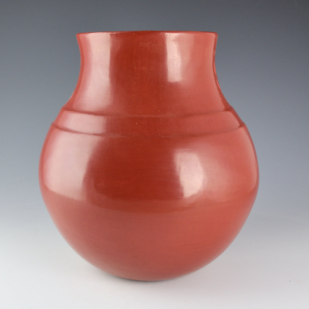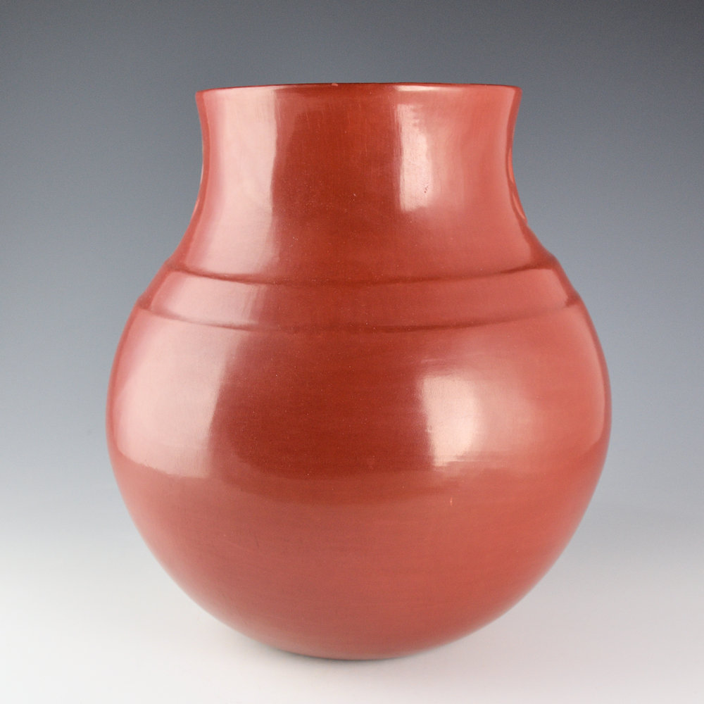 Virginia Garcia is a sister of noted potters Tina Garcia and Greg Garcia. While she no longer makes pottery, much like her siblings, she was known for her traditional forms and creative firings. This large water jar has a double shoulder and a turned-out rim. The there are two bear paws impressed into the clay on the neck. The entire surface is fully polished even the inside of the neck! The jar was traditionally fired outdoors a strong red coloration. It is in excellent condition with no chips, cracks, restoration or repair. It is signed on the bottom in the clay, ‘Virginia Garcia”.