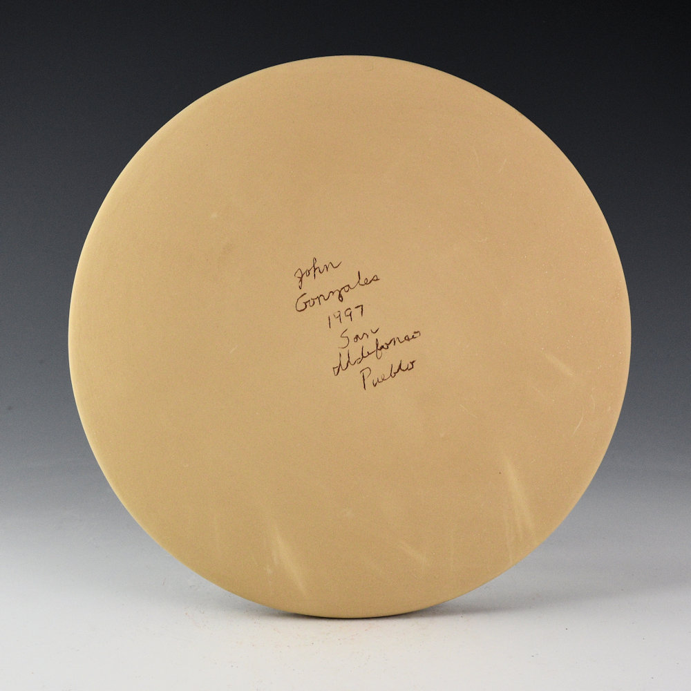 This plate by John Gonzales is from 1997. John was well known for his plates and intricately etched designs. This plate is matte tan. There is a band of feathers around the edged of the plate. The center has an etched avanyu. There is a piece of turquoise for the eye of the avanyu and in the center of the plate. There are two inset rows of shell and turquoise hei-shi beads. The background area, which has been etched away, has a micaceous clay slip. The plate is in excellent condition with no chips, cracks, restoration or repair. It is signed on the back, “John Gonzales”.