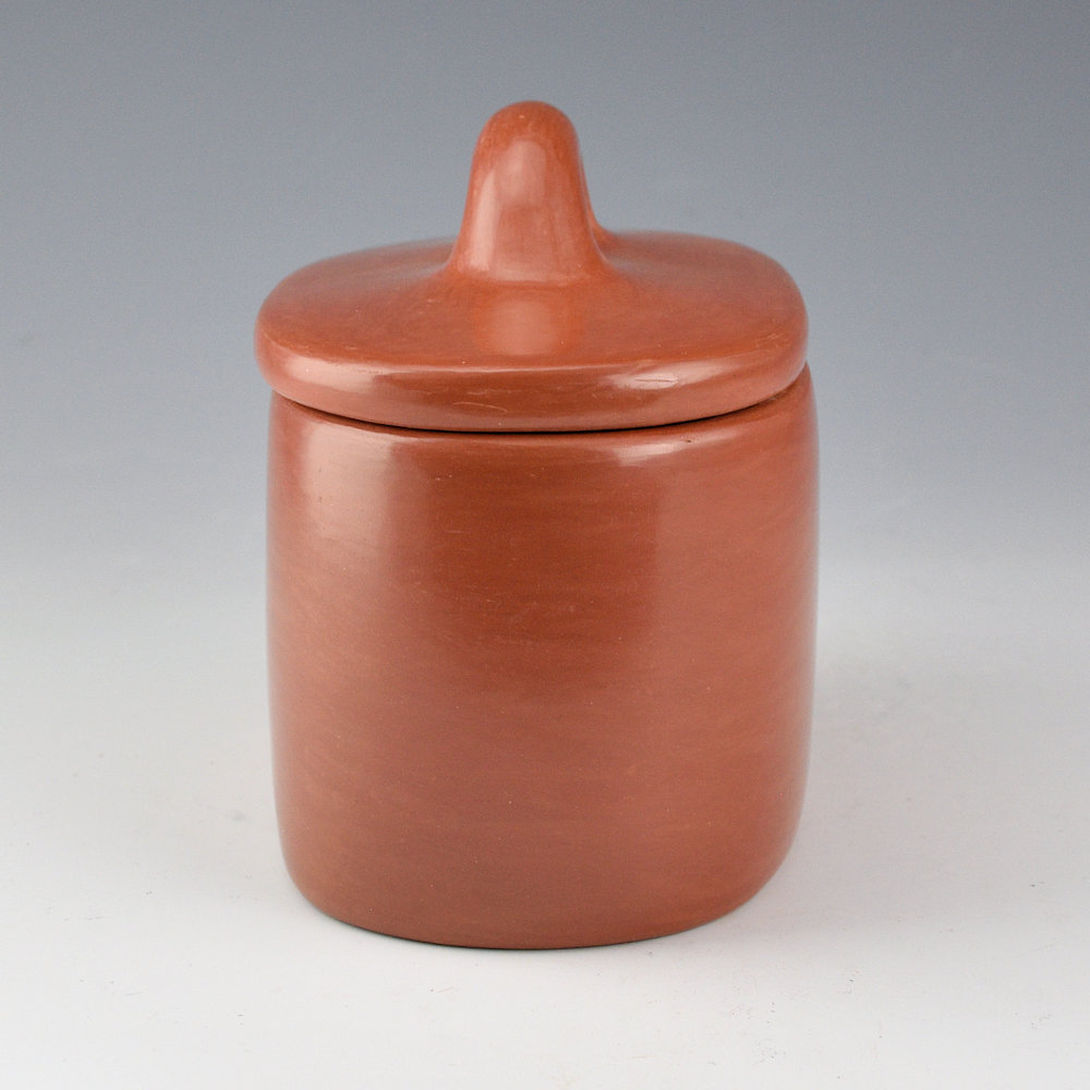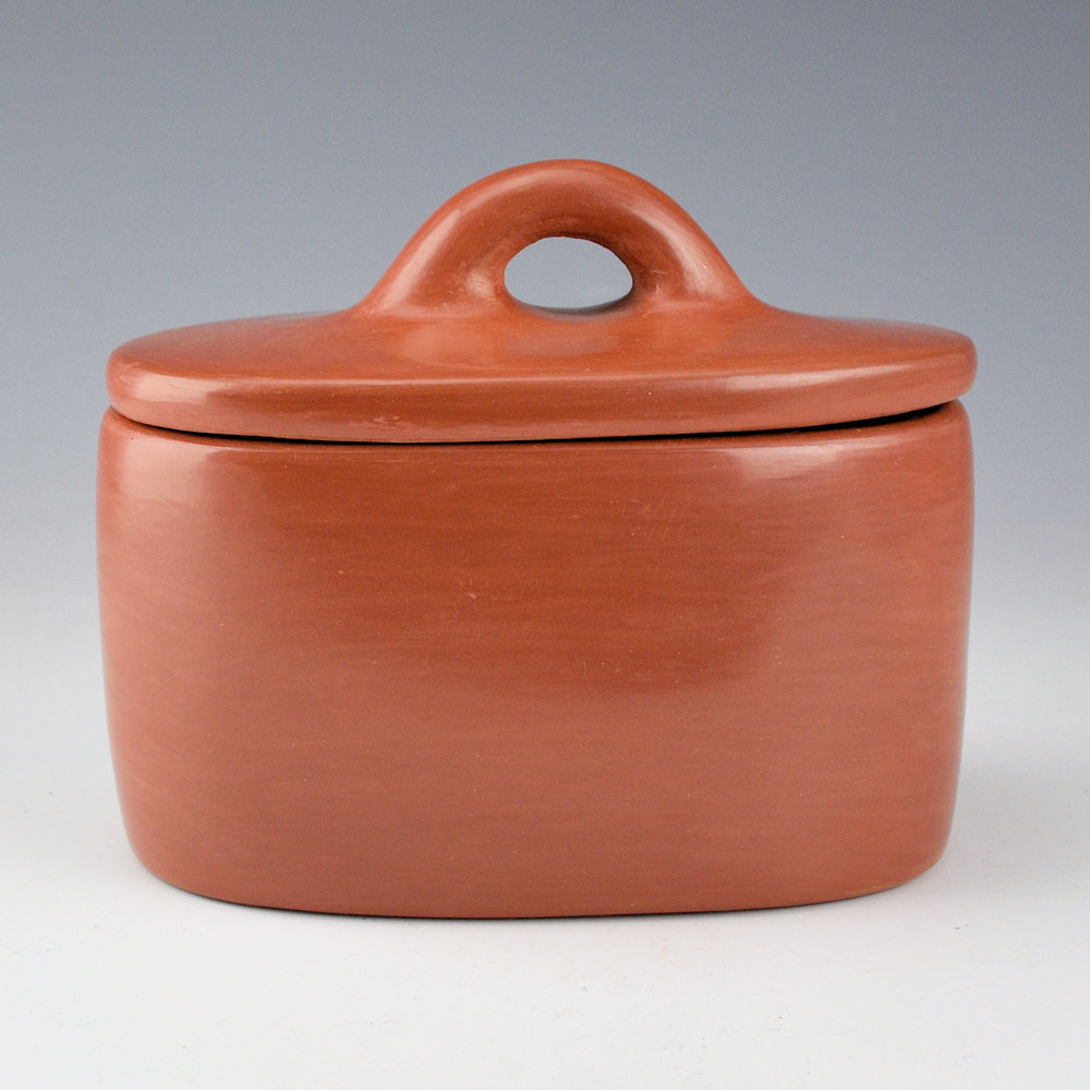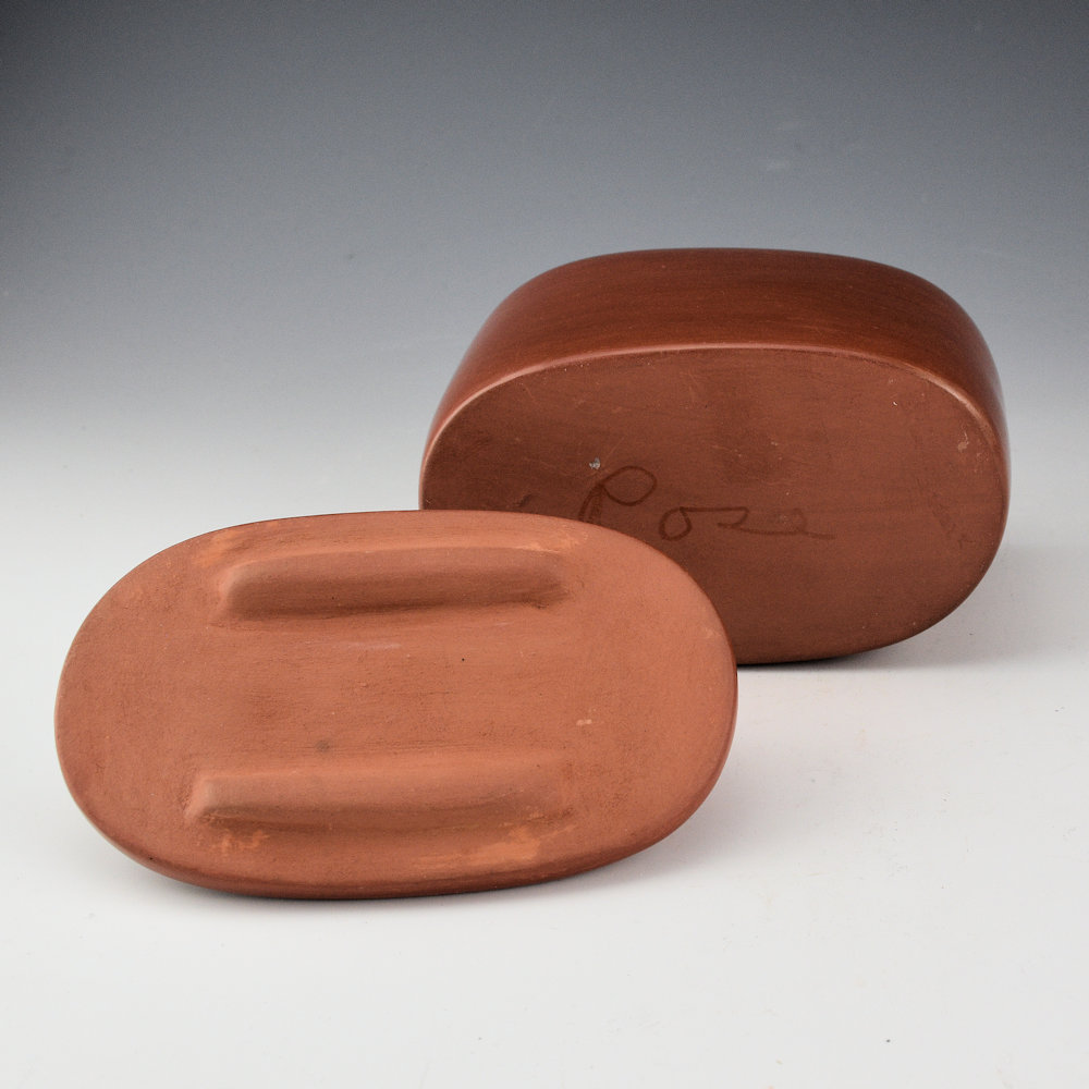 Rose Gonzales is often considered the first at San Ildefonso Pueblo to make carved pottery. However, over the course of her career, she created a variety of styles including plainware, painted and carved pottery. This is one of her few boxes. This piece is oval in shape and the outside and lid are fully polished. The oval lid has a handle. The lid and box were both fired a deep red coloration. It is in excellent condition with no chips, cracks, restoration or repair. It is signed, “Rose” on the bottom in the clay.