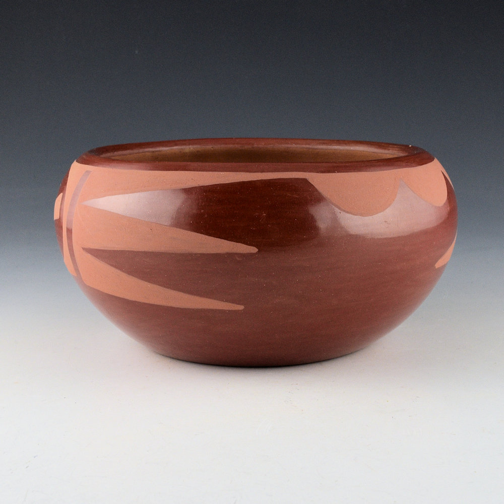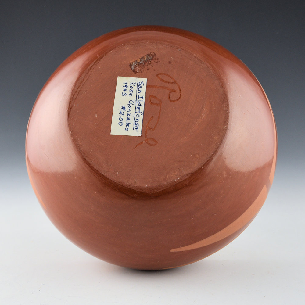 Rose Gonzales is often considered the first at San Ildefonso Pueblo to make carved pottery. However, she also made painted pottery during the course of her career. This bowl is red-on-red. The clients who owned it have a tag on, as they said their parent acquired it in 1943 and paid $2.00. The coloration and style of the bowl seem to fit with that dating. The bowl has a cloud and rain design. The bowl was traditionally fired to a deep red coloration. It is signed on the bottom in the clay, “Rose”. It is in excellent condition with no chips, cracks, restoration, or repair. Rose’s legacy can certainly be seen in the work of Tse-Pe, Dora Tse-Pe, and Russell Sanchez.