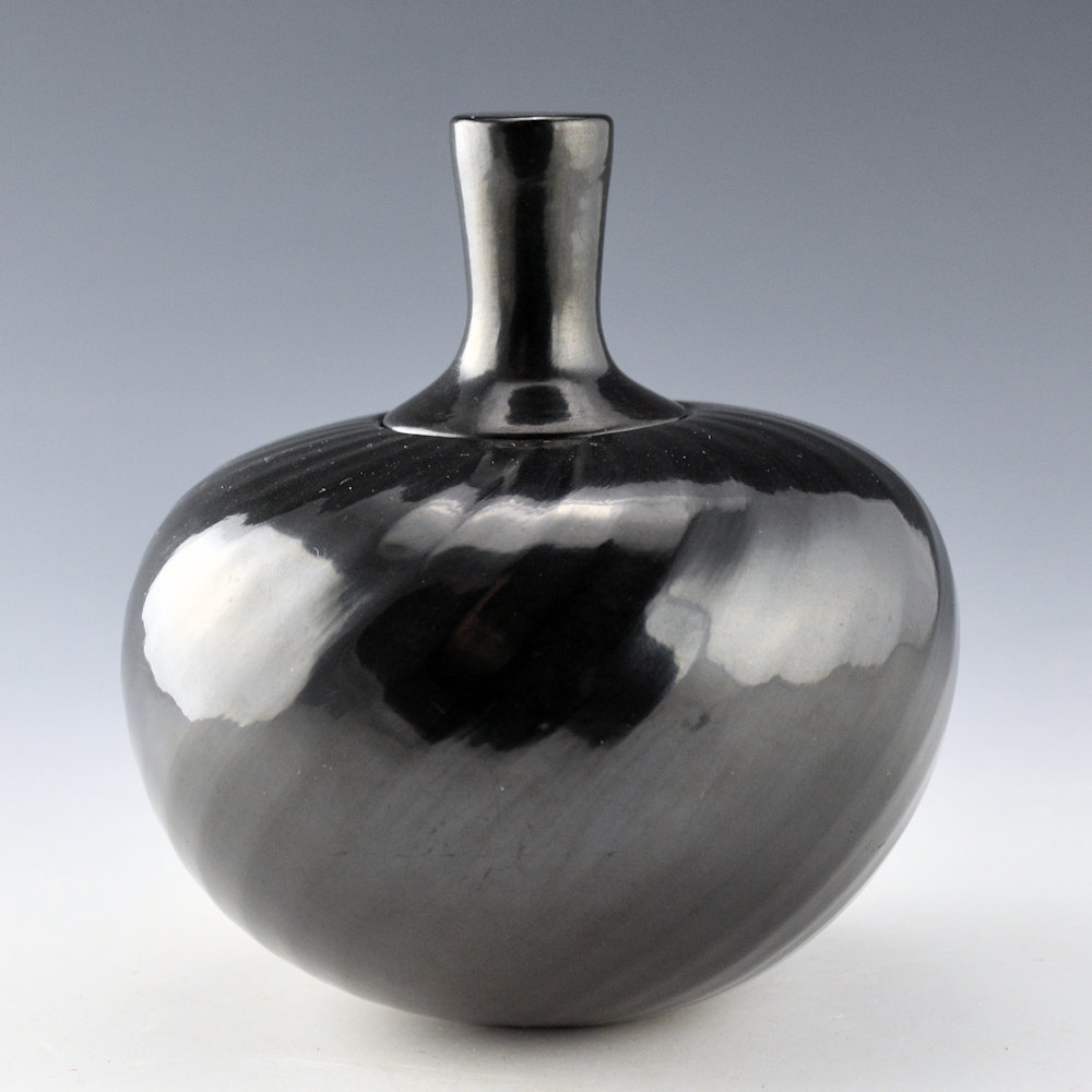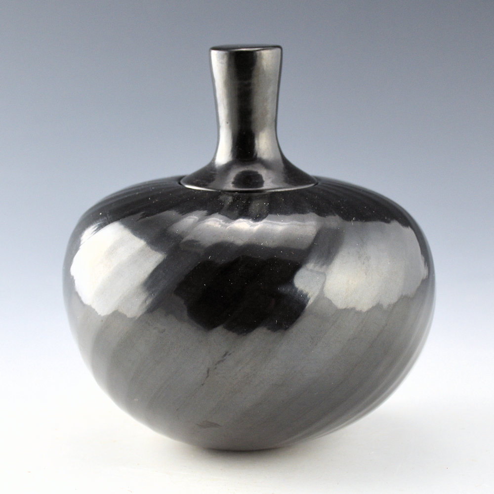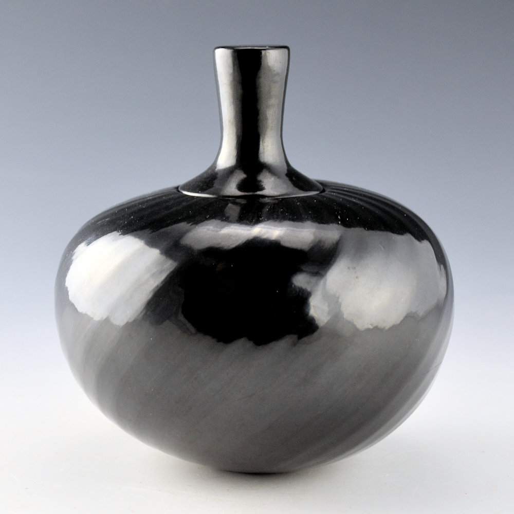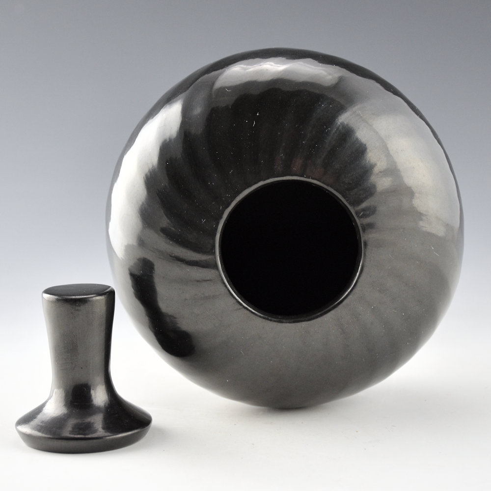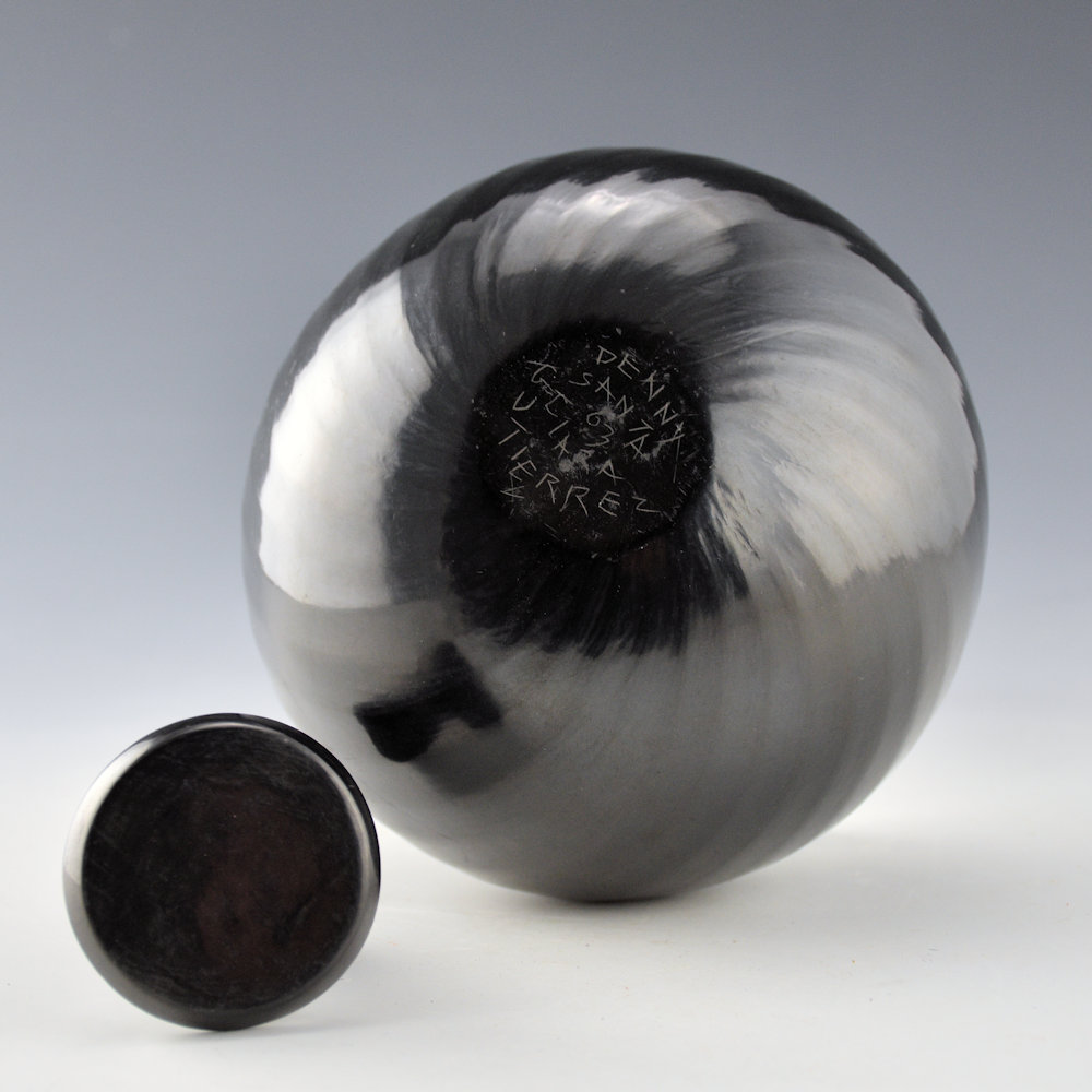 Denny Gutierrez was known for his faceted melon bowls. This piece has 36 swirling ribs that extend from the rim to the base. There is a ridge and then the flat part that creates the “facet”. The result is a striking visual appearance on the bowl as the light reflects against the various surface angles with such tightly spaced ribs! The bowl is polished to a glossy shine. There is a plain, fully polished lid for the top. It is from 1993. It is in excellent condition with no chips, cracks, restoration, or repair. It is signed on the bottom in the clay, “Denny Gutierrez”.