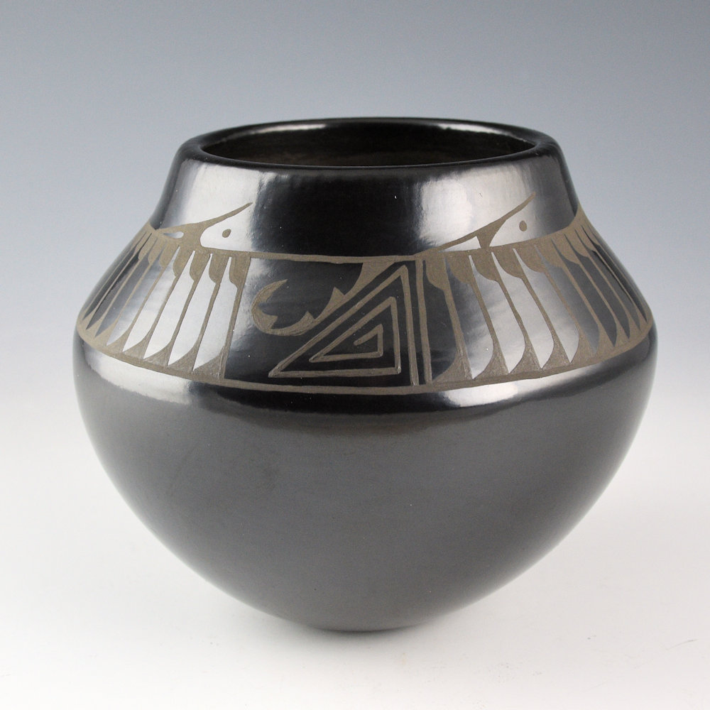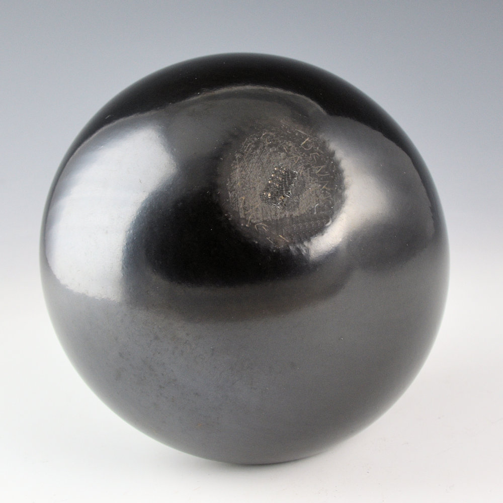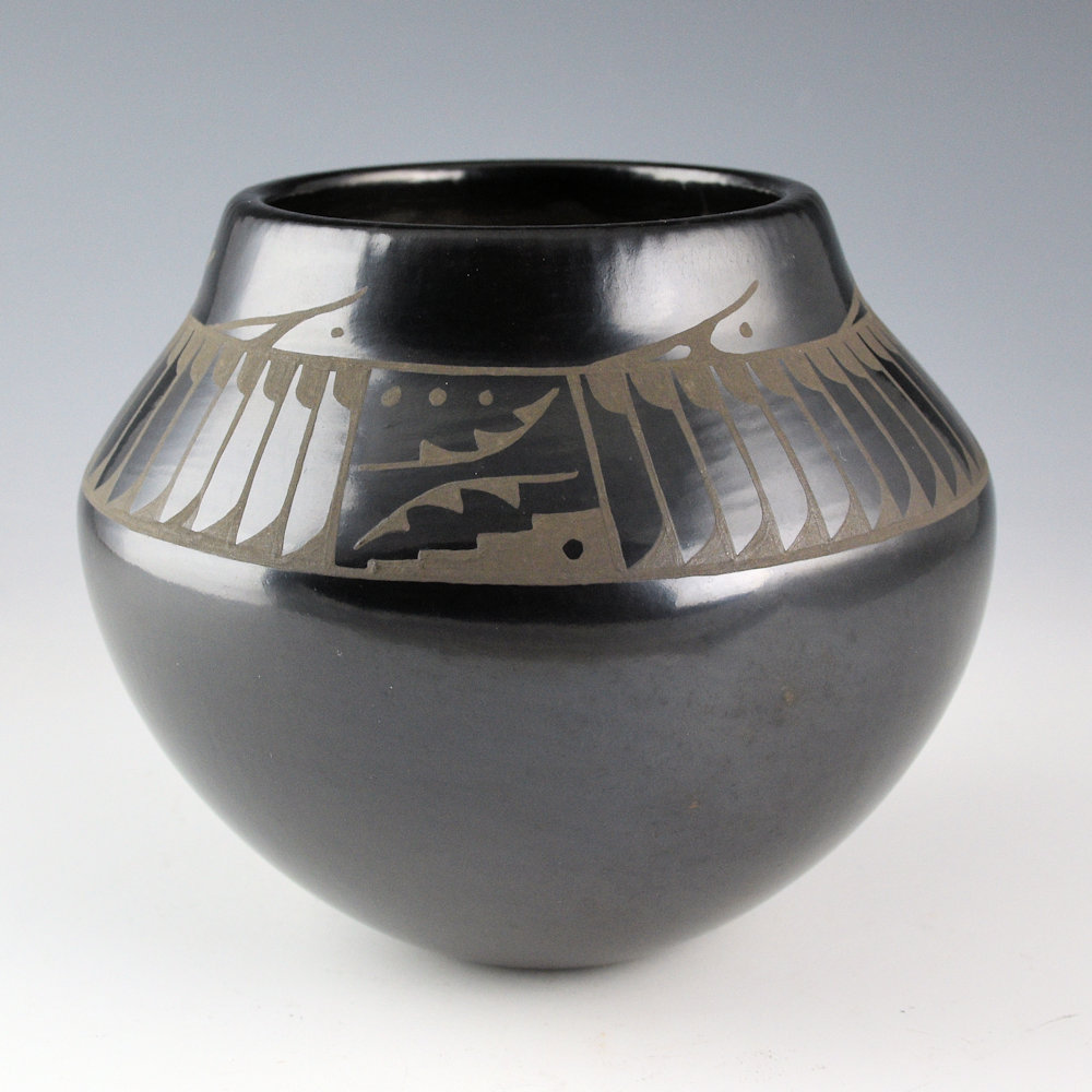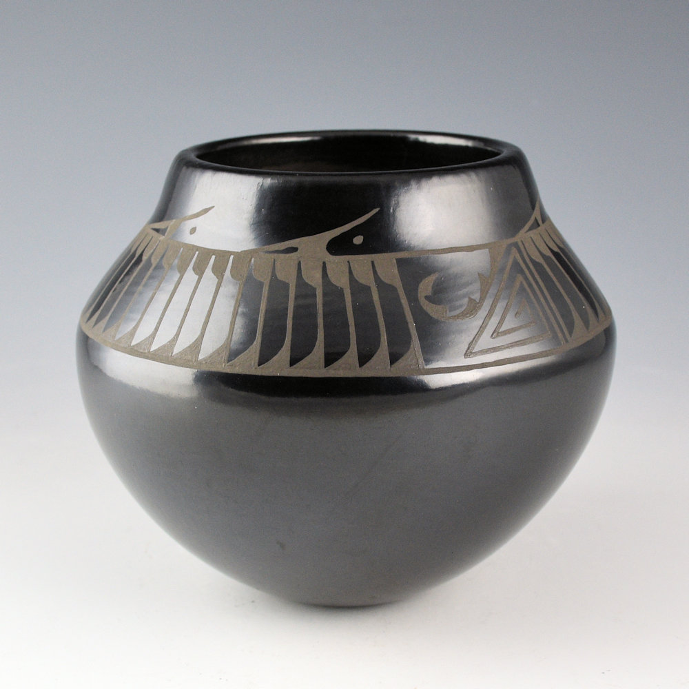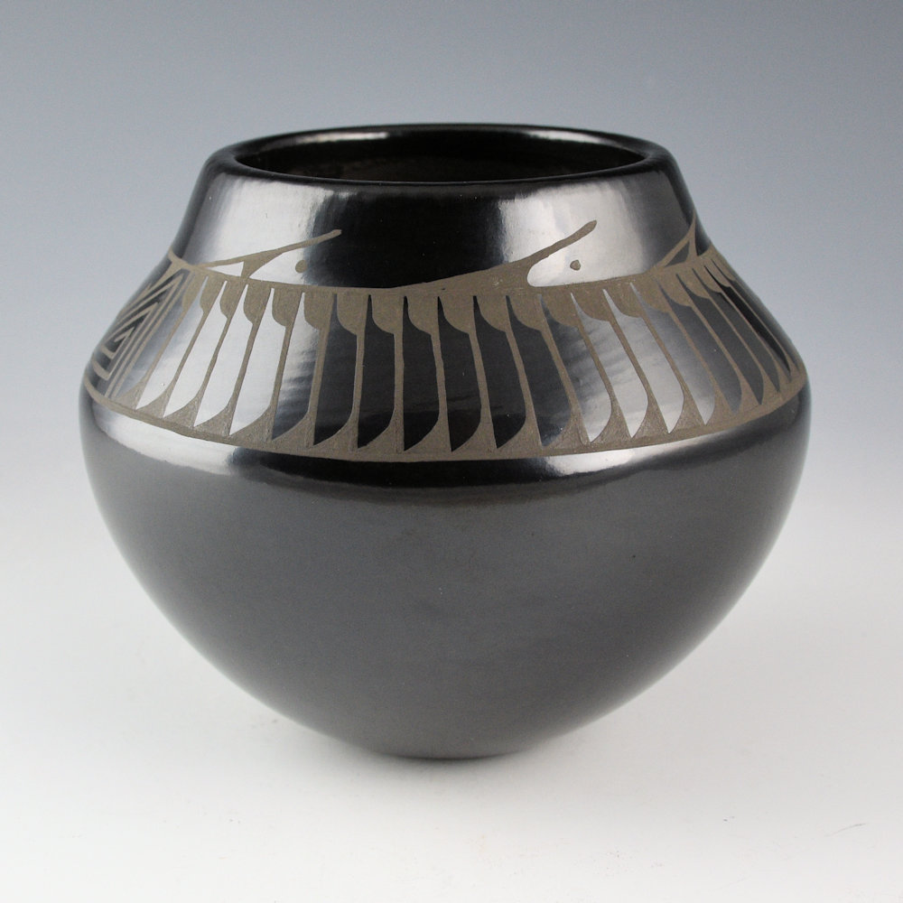 Denny Gutierrez was known for his faceted melon bowls. However, he also created exceptional painted vessels. This jar has a sloping shoulder and a slight neck. It is fully polished and painted with very tightly painted feathers. There are 45 feathers encircling the jar in two sections. Note how they are painted at a slight angle. Separating them is a sections with stars designs and the opposite side has a crescent moon. The jar is polished to a glossy shine. It is from 1987. It is in excellent condition with no chips, cracks, restoration, or repair. It is signed on the bottom in the clay, “Denny Gutierrez”.