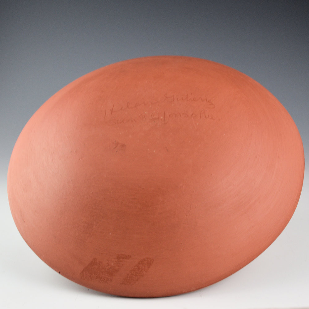 This is a classic large plate by Helen Gutierrez (1935-1993). She was a daughter of Isabel Atencio, a sister of Gilbert Atencio, and the mother of Geraldine, Carol, and Rose Gutierrez. She was known for her traditional San Ildefonso pottery. This plate is fully polished on the front. It has two sections of feather designs, and two sections of bird wings. It is a combination of two classic San Ildefonso designs. The designs were painted onto the polished surface before it was fired. It is a cream-colored clay on the polished red. Typical of her work it is highly polished and precision painted. It was traditionally fired. The plate is signed on the back, “Helen Gutierrez”. It is in very good condition with no chips, cracks, restoration, or repair.