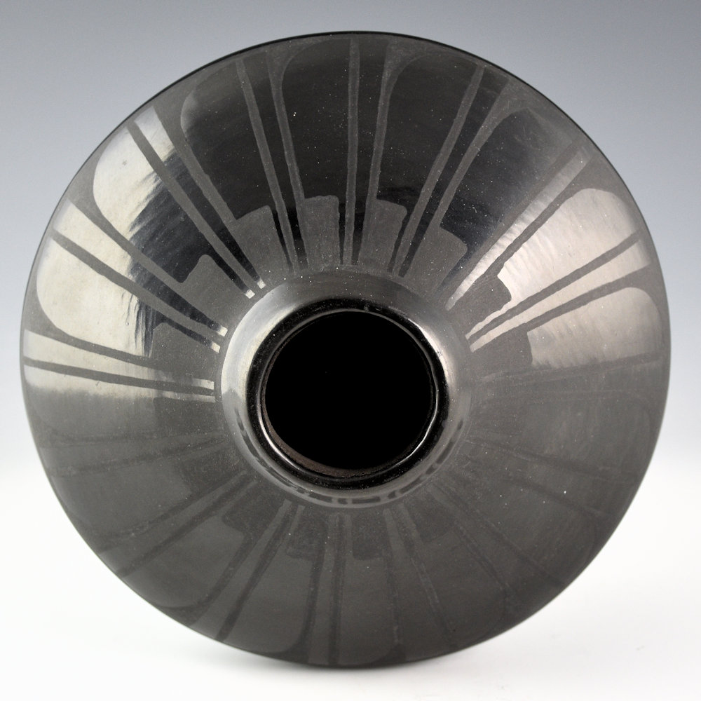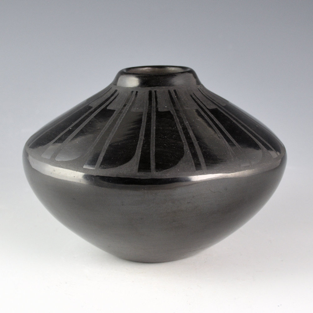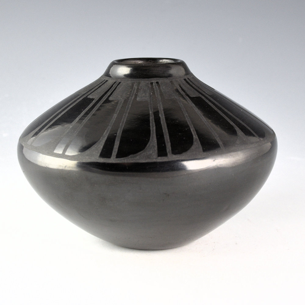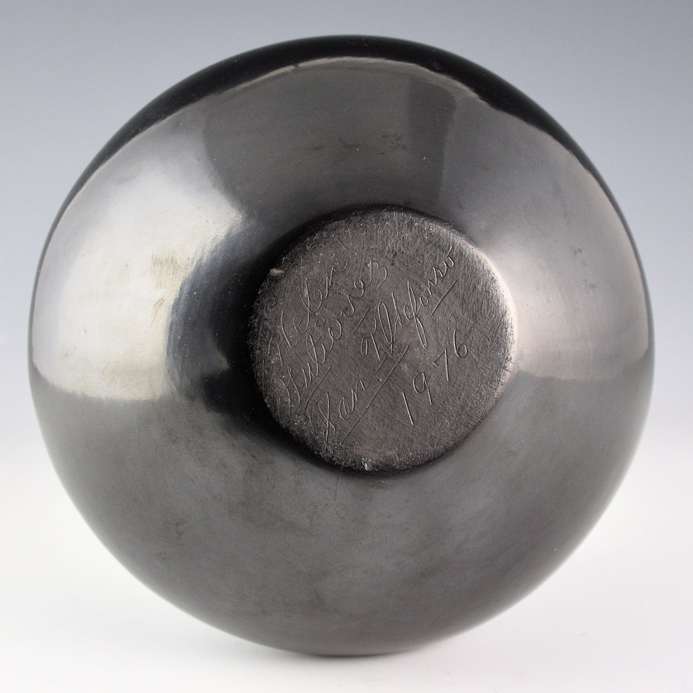 Helen Gutierrez (1935-1993) was a daughter of Isabel Atencio, a sister of Gilbert Atencio, and the mother of Geraldine, Carol, and Rose Gutierrez. She was known for her traditional San Ildefonso pottery. This jar is one of her classic shapes. It is highly stone polished to a glossy surface. The jar is painted with a feather pattern with 16 feathers, each alternating with a linear rain design. Note the precision of her painting and the highly polished surface! The jar was traditionally fired to a deep black coloration. It is signed on the bottom in the clay, “Helen Gutierrez”. It is in excellent condition with no chips, cracks, restoration or repair.