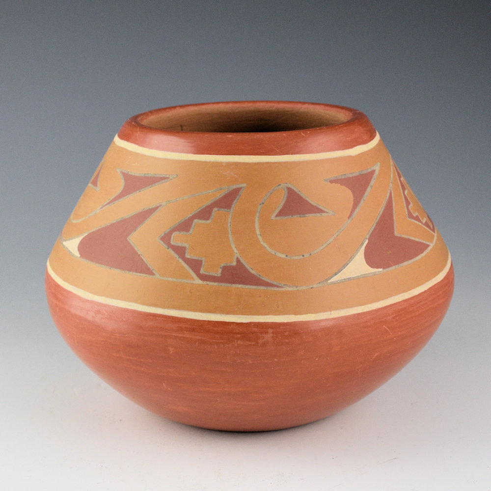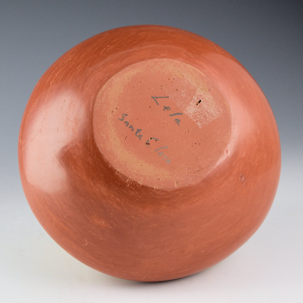 Lela Gutierrez began making pottery in the 1930’s. This is one of those early pieces with a polished rim and base along with a polychrome painted central section. She was among the first to begin making polychrome pottery at Santa Clara. The central band has delicately painted cloud and rain designs using white, black, and red colored clays. It is a fascinating piece in design. It is signed on the bottom, “Lela”. The jar is in very good condition with no chips, cracks, restoration or repair.