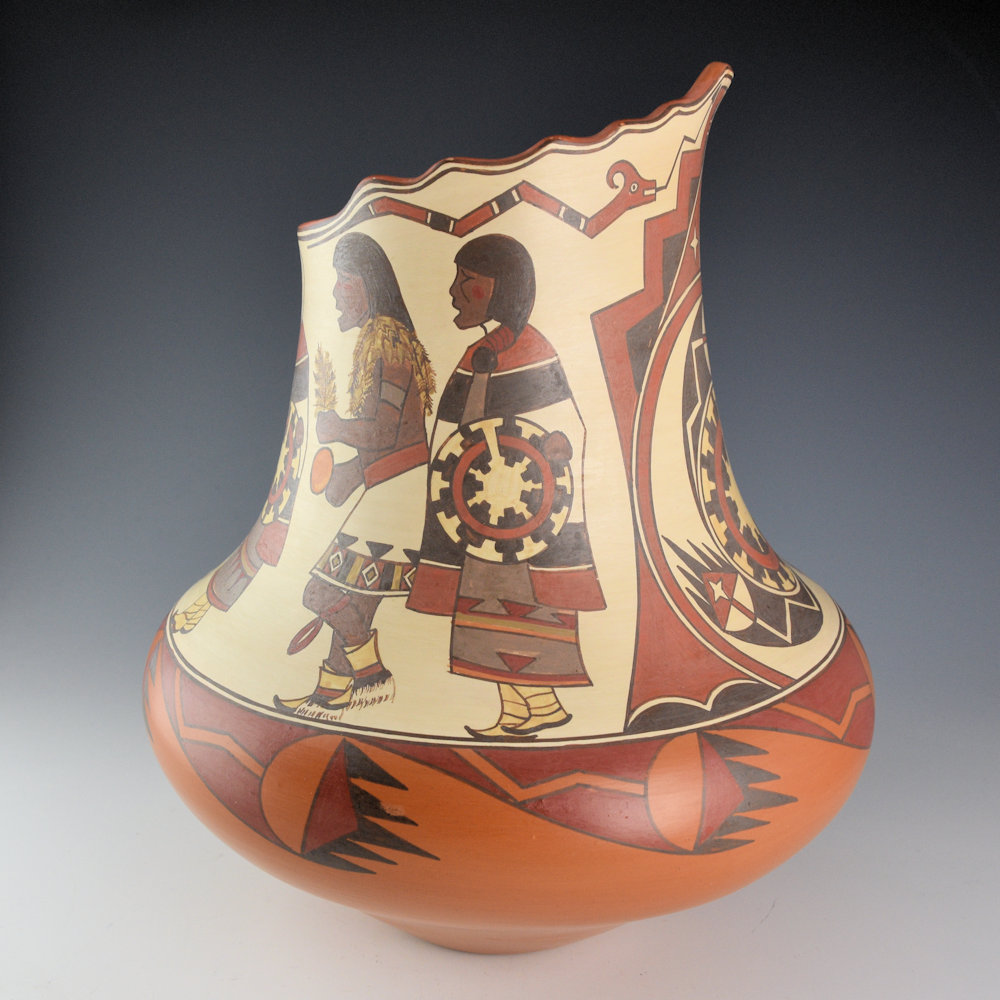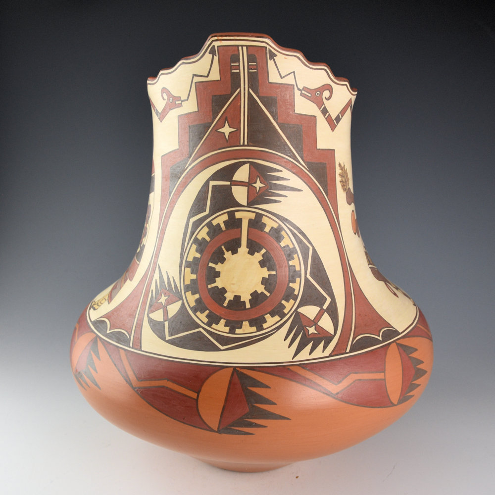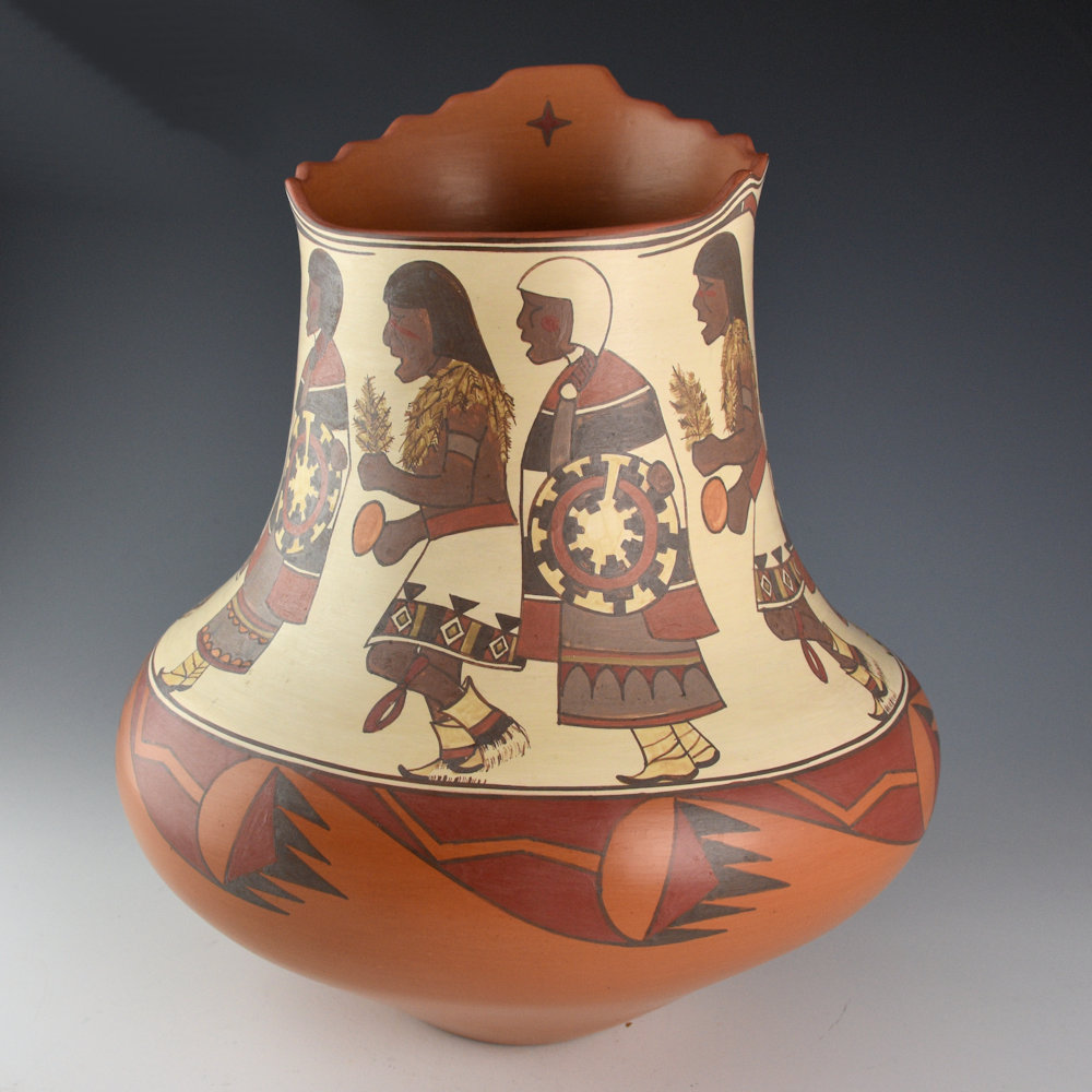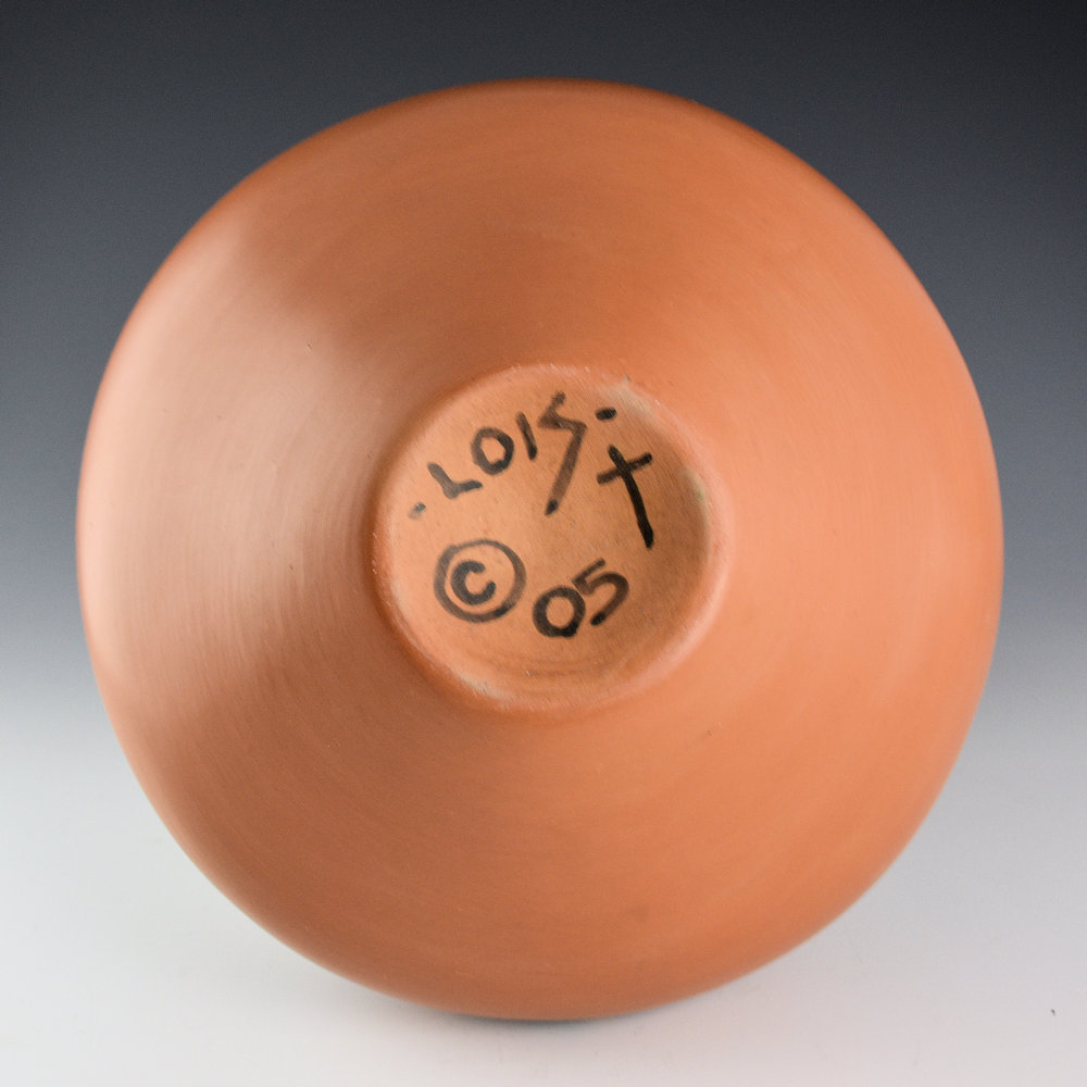 This is a traditional complex polychrome kiva step jar by Lois Gutierrez. She is one of the few potters who continues to create polychrome pottery at Santa Clara. Polychrome, or more than three different colors of clay slips, are all painted onto the surface of the vessel before it is fired. This jar has a round body, elongated neck, and the neck is carved with a kiva step section. The body of the jar has six Baskets Dancers at Santa Clara Pueblo, alternating male and female. They are each detailed in their painted designs from the basket to the kilts. There is a large basket painted on one section of the jar. It is surrounded by swirling avanyu horns and it is under a cloud pattern. Near the rim are two avanyu. The inside of the neck has a painted star. The shoulder of the jar has additional avanyu horn designs. The jar is creative and striking in person. There are SIX different colors of clay on this jar. Did you know that Lois collects each of the different clays from around Santa Clara Pueblo in order to create these colorations? The jar was traditionally fired. It is signed on the bottom, “Lois 05”. It is in excellent condition with no chips, cracks, restoration, or repair.