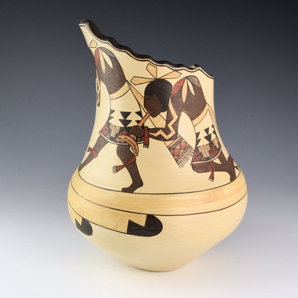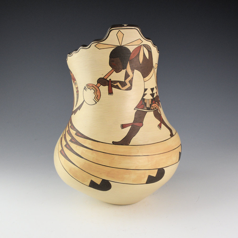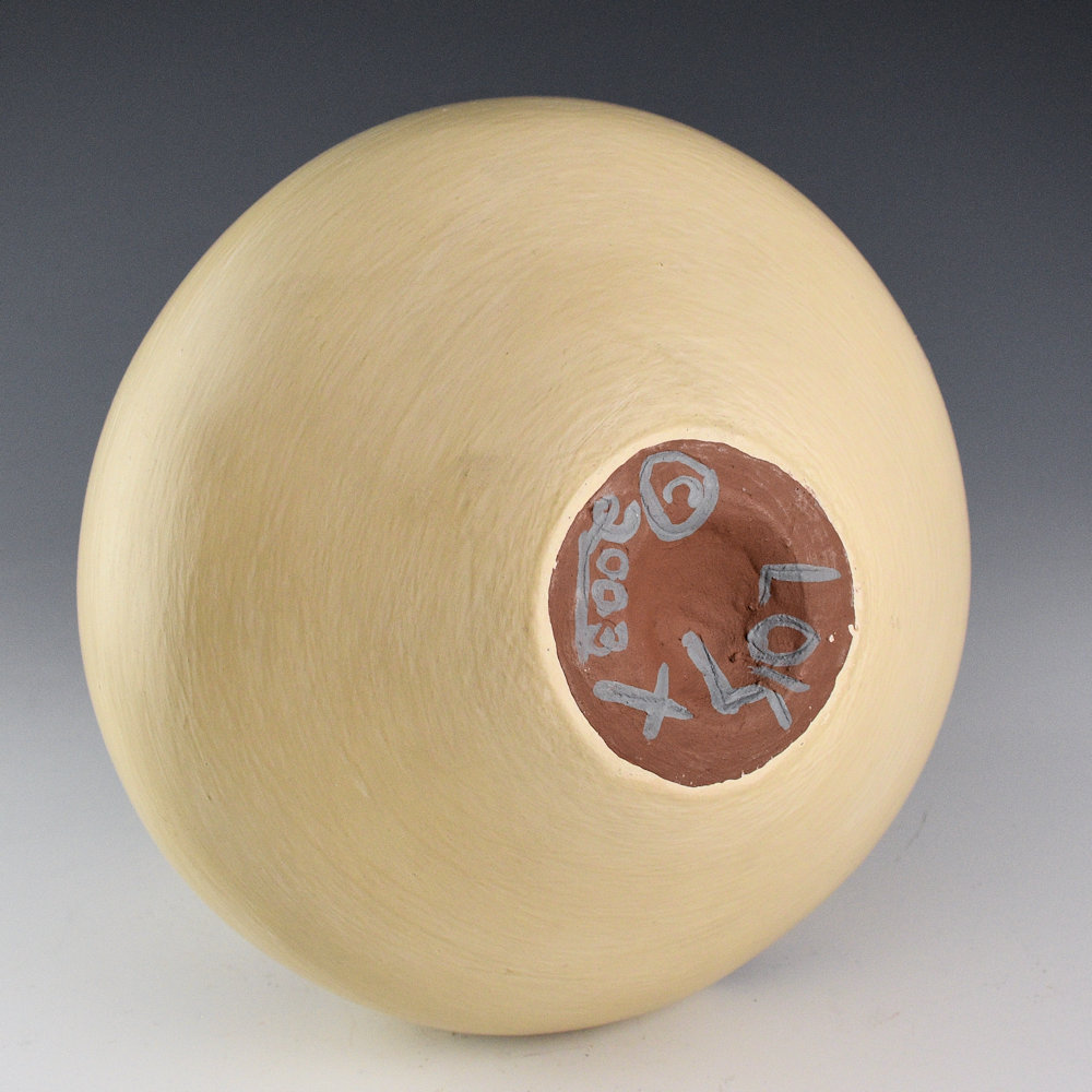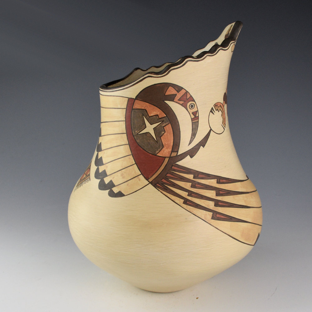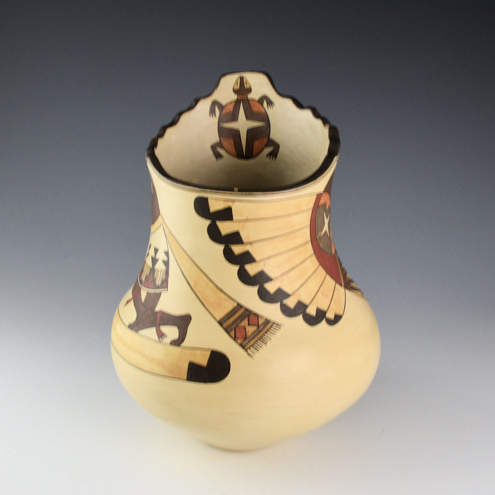 This is a complex polychrome kiva step jar by Lois Gutierrez. She is one of the few potters who continues to create polychrome pottery at Santa Clara. Polychrome, or more than three different colors of clay slips, are all painted onto the surface of the vessel before it is fired. This jar has a round body, elongated neck, and the neck is carved with a kiva step section. The neck of the jar has two flute players and an eagle. Note the detail in the kilts and sashes of the flute players. The eagle is also highly detailed and colorful and the tail feathers swirl around the jar, creating the ground for the flute players!. The inside of the neck has a turtle with a star on its back. There are SIX different colors of clay on this jar. Did you know that Lois collects each of the different clays from around Santa Clara Pueblo in order to create these colorations? The jar was traditionally fired. It is signed on the bottom, “Lois 03”. It is in excellent condition with no chips, cracks, restoration, or repair.