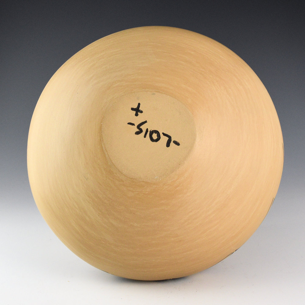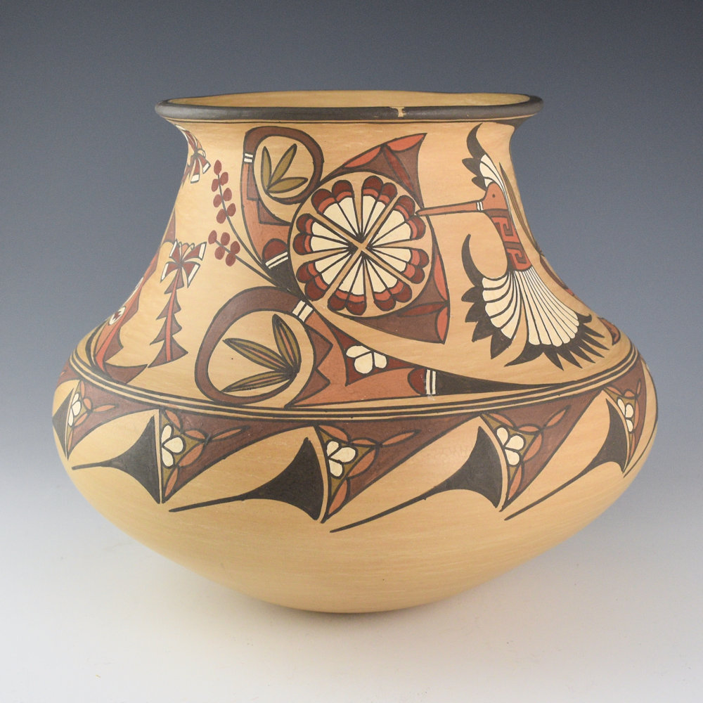 This is a complex polychrome water jar by Lois Gutierrez. She is one of the few potters who continues to create polychrome pottery at Santa Clara. Polychrome, or more than three different colors of clay slips, are all painted onto the surface of the vessel before it is fired. This is a water jar shape with a round shoulder and an elongated neck. The jar is a classic shape for Santa Clara. Along the shoulder are cloud and rain designs. The neck has hummingbirds and colorful flowers. There are additional flowers separating the birds. It is a striking use of designs and form. The jar has SIX different colors used for the designs. Did you know that Lois collects each of the different clays from around Santa Clara Pueblo in order to create these colorations? The jar was traditionally fired which created slight colorations on the base of the piece. It is signed, “Lois” and the jar is in excellent condition with no chips, cracks, restoration, or repair.