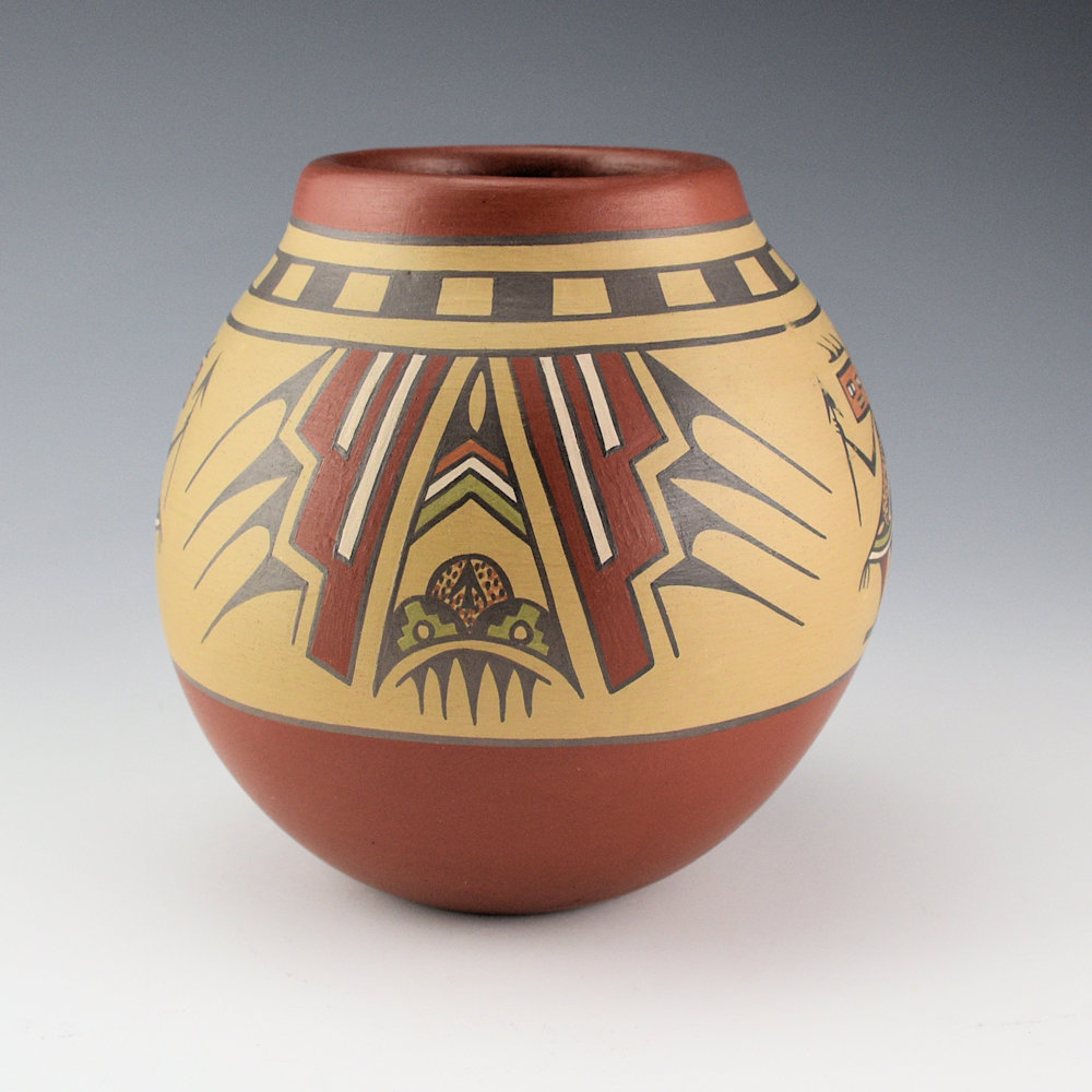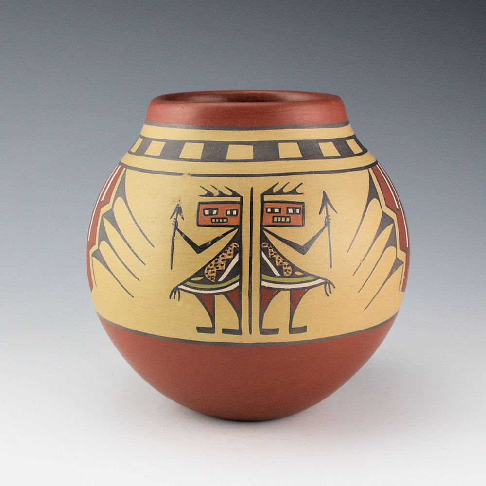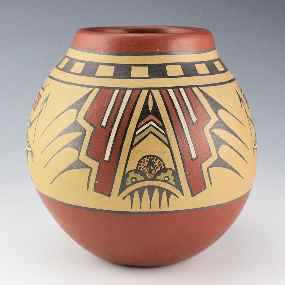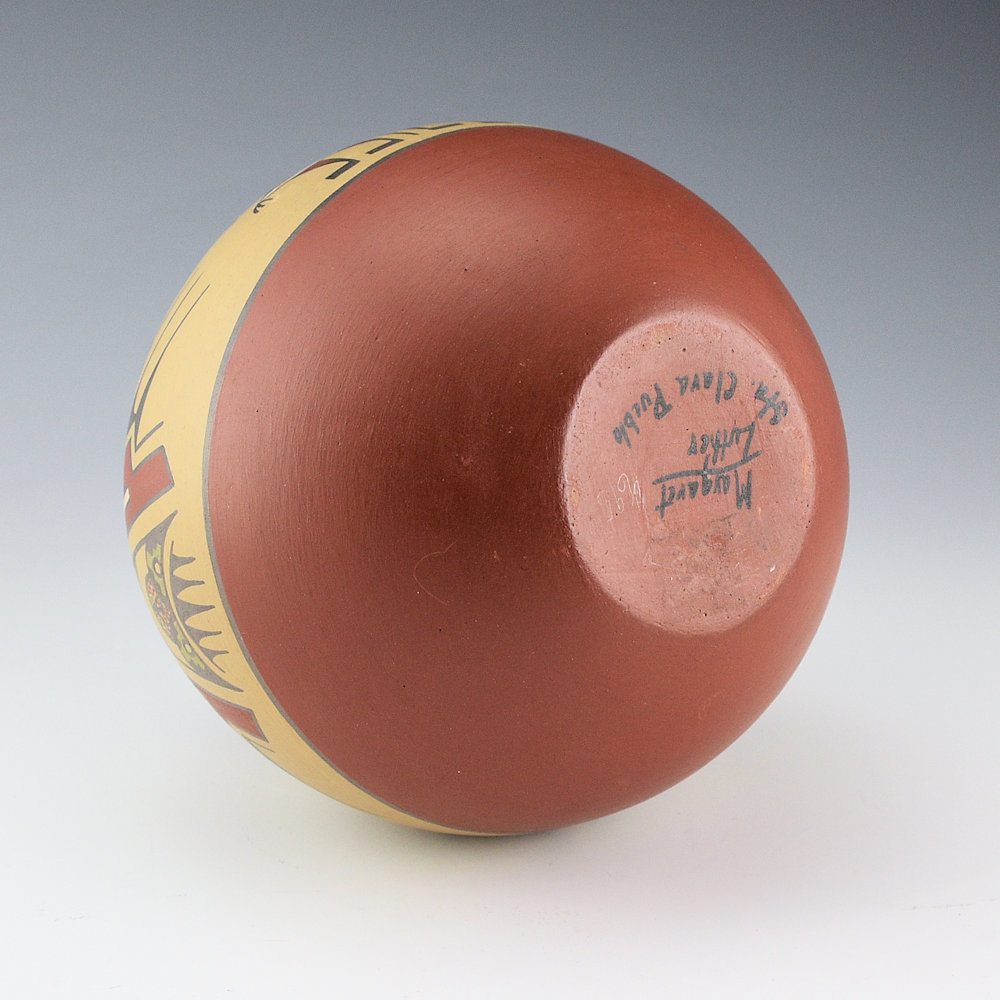 This is a traditional jar by Margaret & Luther Gutierrez. Margaret would make the pottery and her brother Luther would paint the designs using natural clay slips. They began working together in 1966 when their mother, Lela Gutierrez, passed away. This jar has a round body and a short neck. The neck is painted red and there is a checkerboard design. The body of the jar has two sets of figures. Separating them are rain clouds with lightning designs. The piece has at least SIX different colors used to create the designs. They would be painted onto the piece before it was fired. All the various colors are from natural clay slips and this was a signature style of their work. The jar is signed on the bottom, “Margaret / Luther”. It is in excellent condition with no chips, cracks, restoration, or repair.