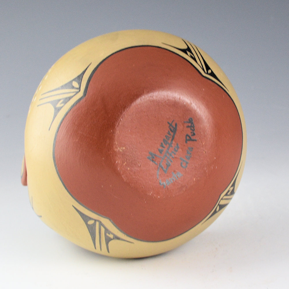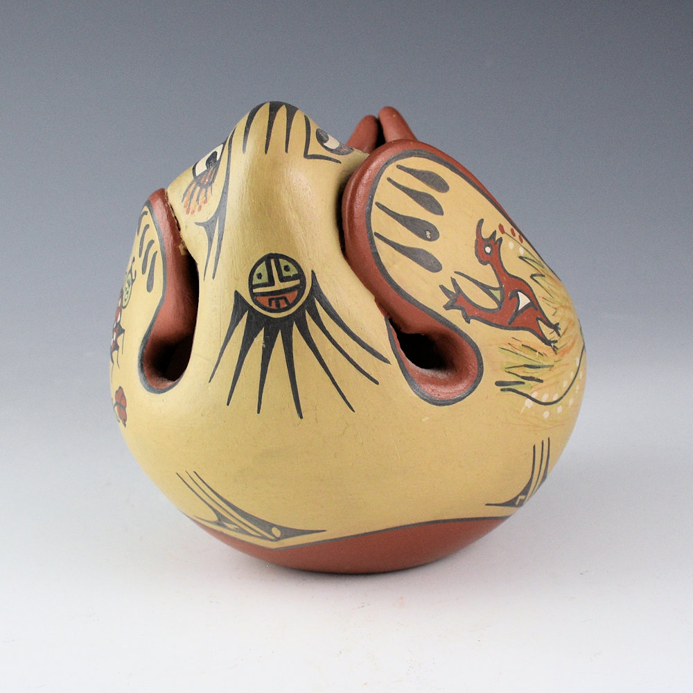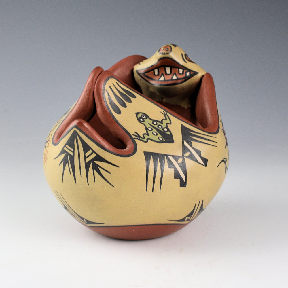 This is a “reclining otter” bowl by Margaret and Luther Gutierrez.  The piece is coil-built and then the head was added. The bowl is in the appearance of an otter on its back.  The legs have a frog and lady bug on one side. The opposite side has a bird and a hunter with a deer.  The claws are painted on the feet and the back has a sun.  Of course, the face is whimsical in the style of their painting.  All the various colors are derived from natural clay slips.  It is in excellent condition with no chips, cracks, restoration or repair.  It is signed on the bottom, “Margaret/Luther”.