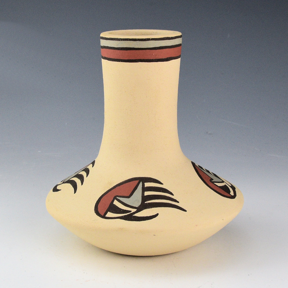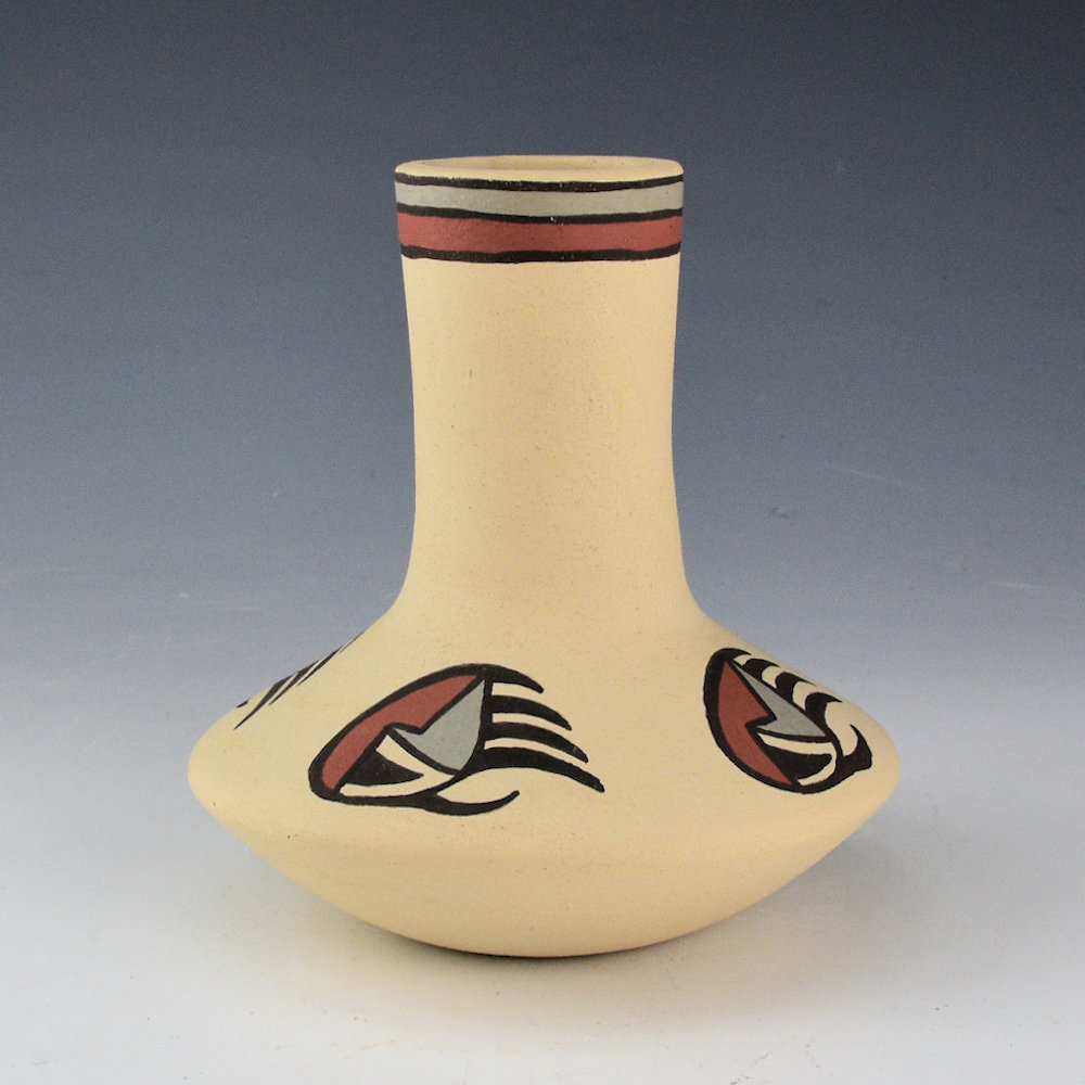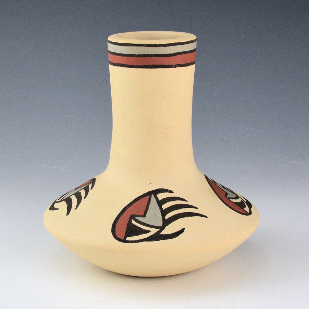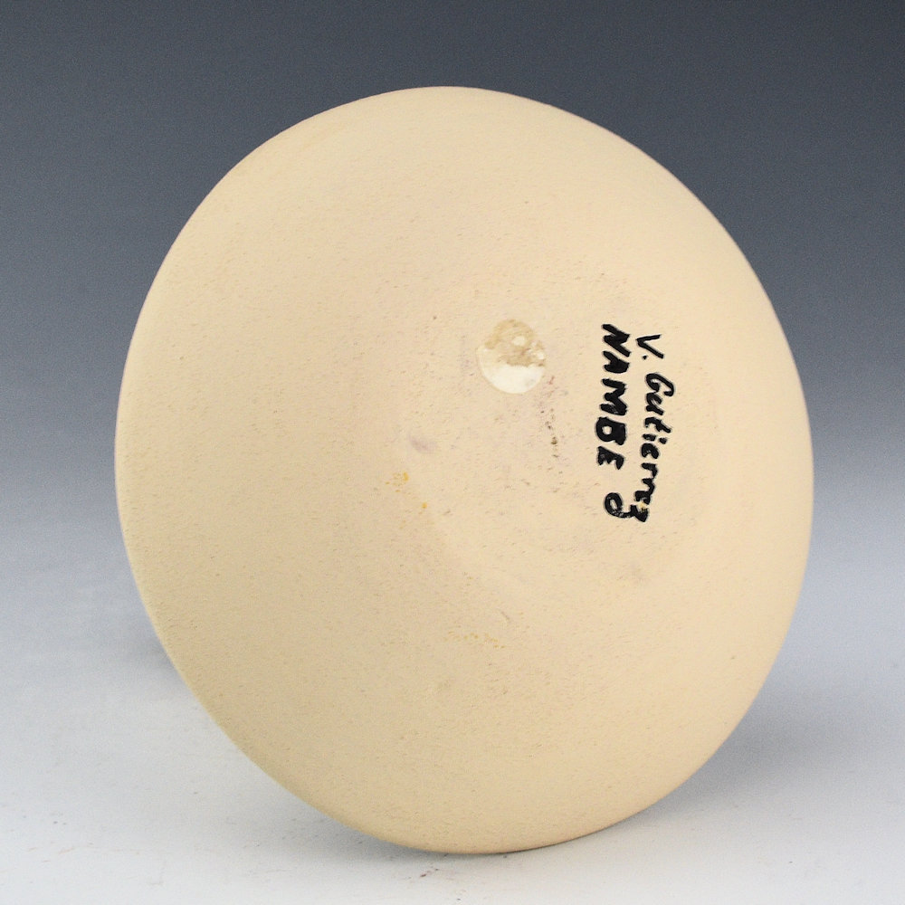 Virginia Gutierrez was of the few polychrome potters from Nambe Pueblo. She was known for her experimentation with various clay slips. This long neck jar has a sharp shoulder. There are four bear paws painted onto the top of the shoulder. There is an additional rainbow band around the neck. The jar has four different colors of clay used on the piece. It is signed on the bottom, “V. Gutierrez”. It is in excellent condition with no chips, cracks, restoration, or repair.