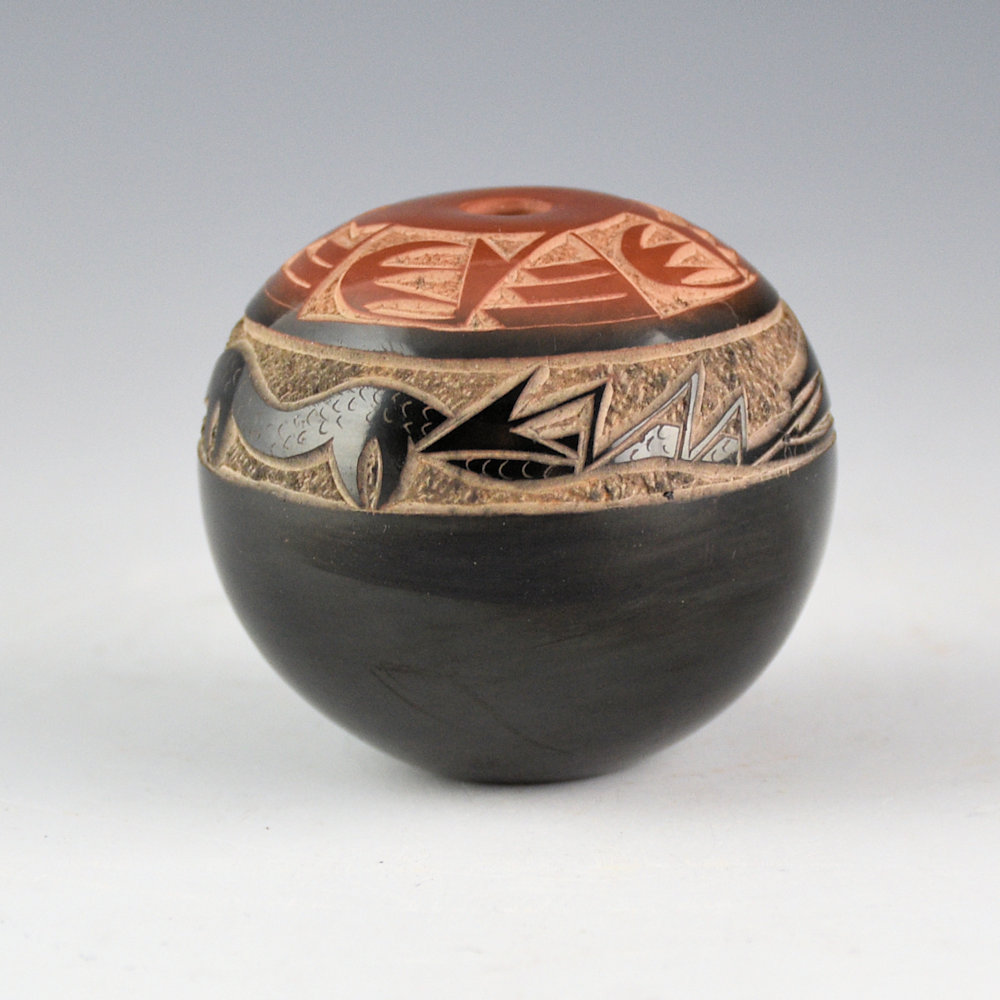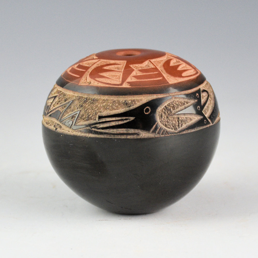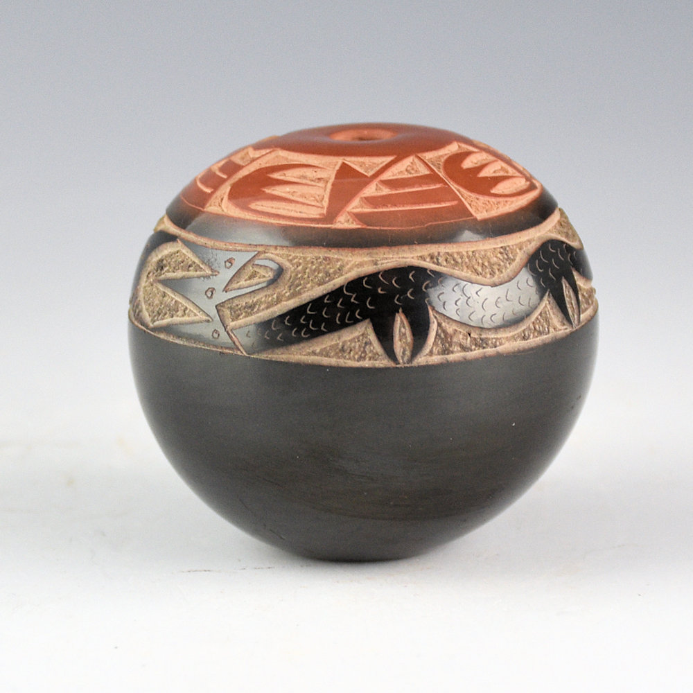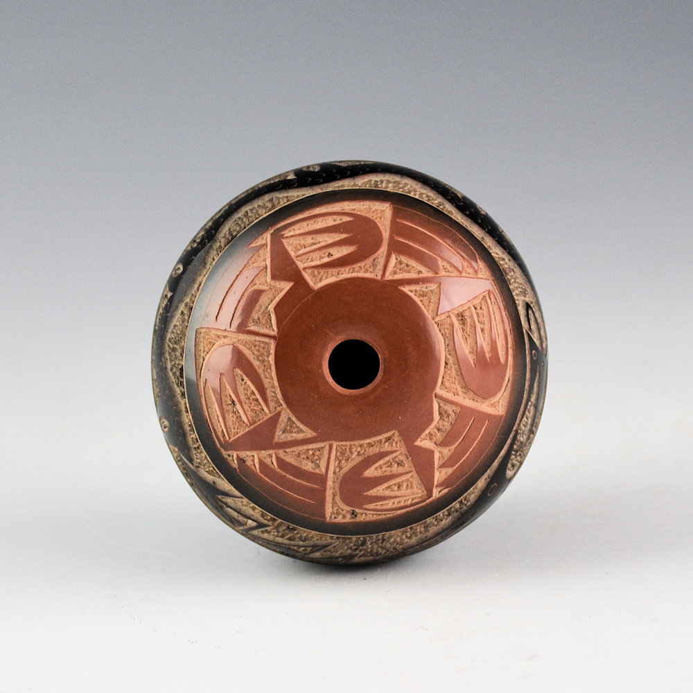 Haungooah, Art Cody – Black and Sienna Avanyu and Bird Wing Seedpot (1978)