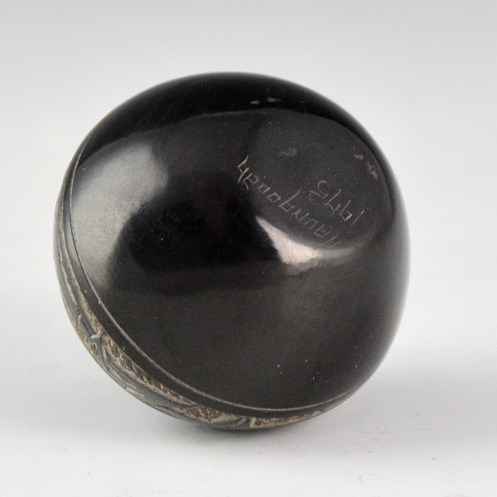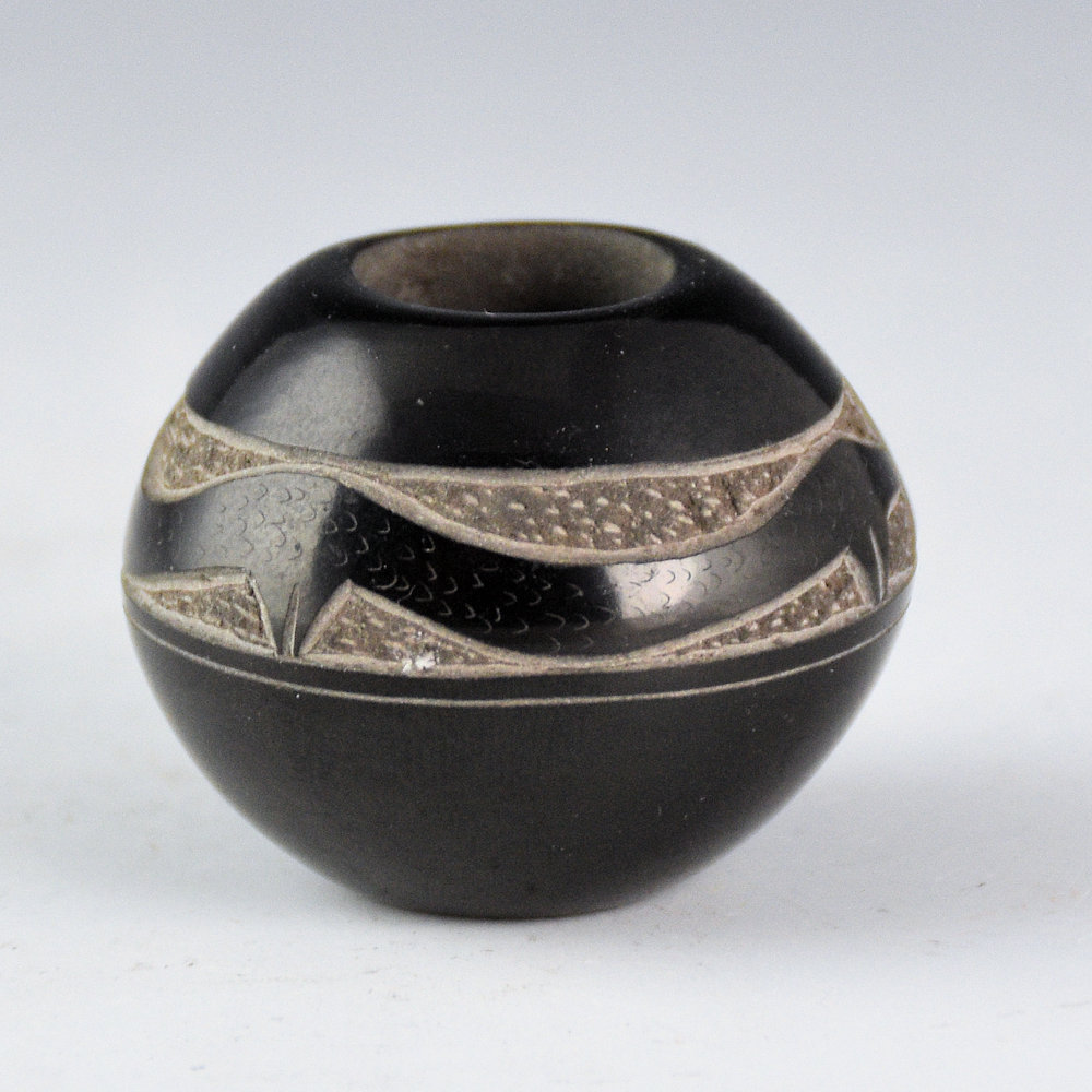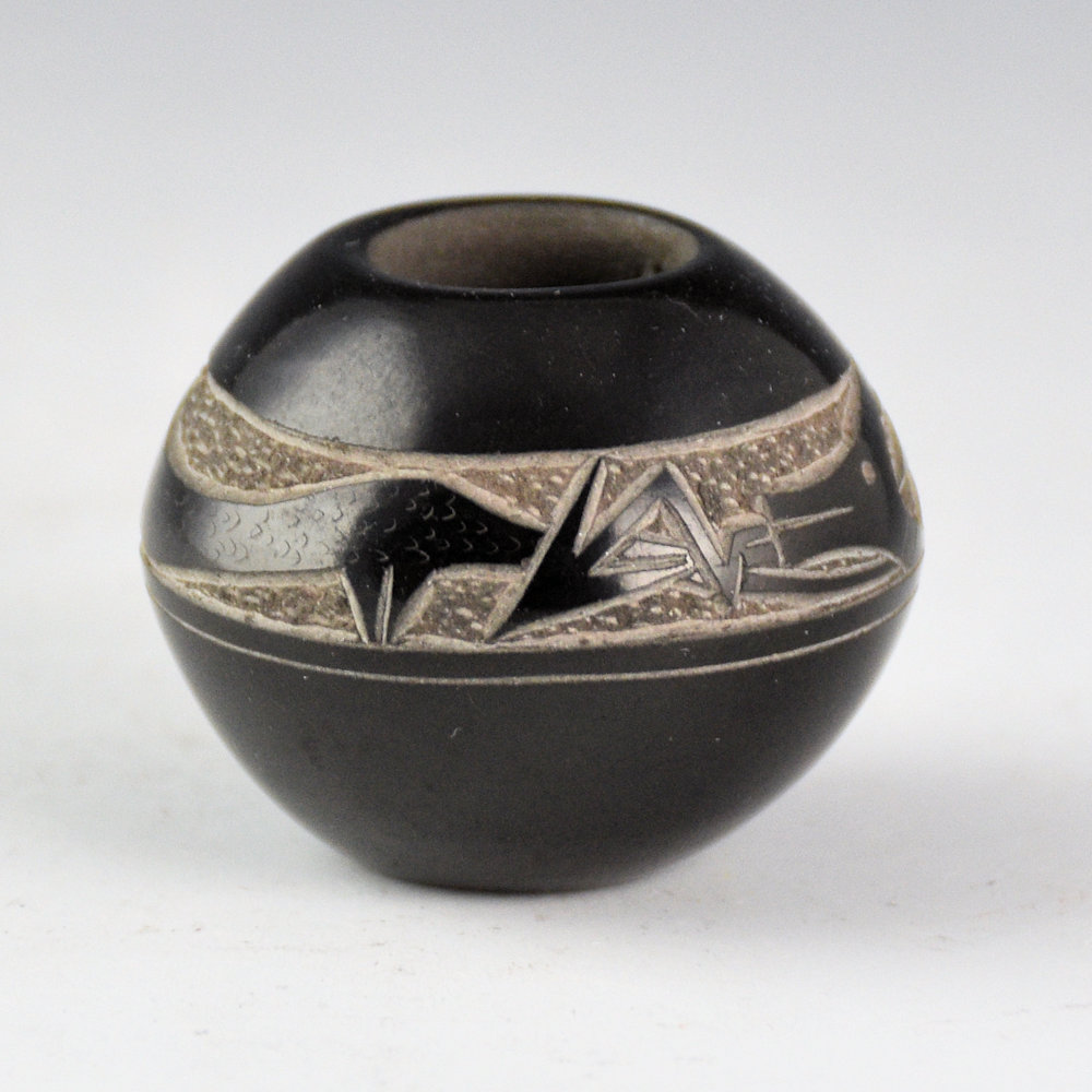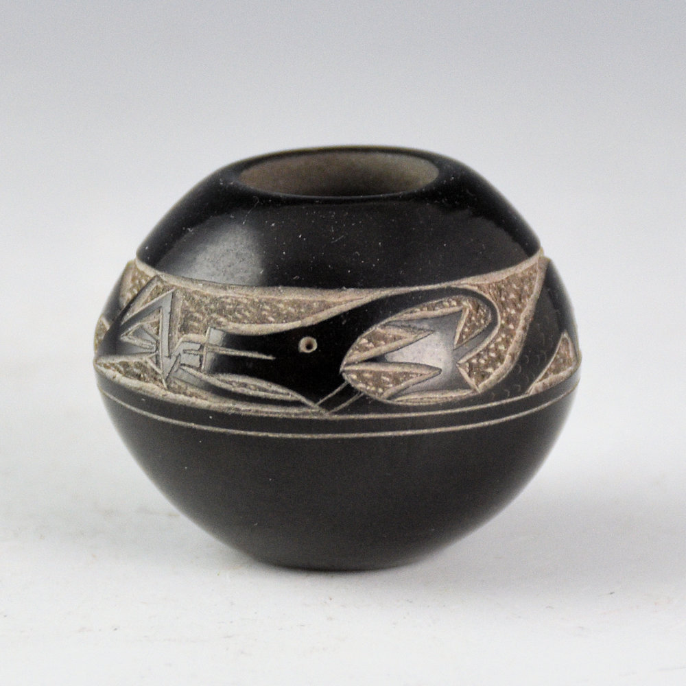 This is a small but intricately etched bowl by Art Cody Haungooah. It was fully polished and then etched with an avanyu. It is a delicate design with the avanyu surrounded by lightning and cloud designs. It is signed on the bottom in the clay, “Haungooah”. It is in excellent condition with no chips, cracks, restoration, or repair.