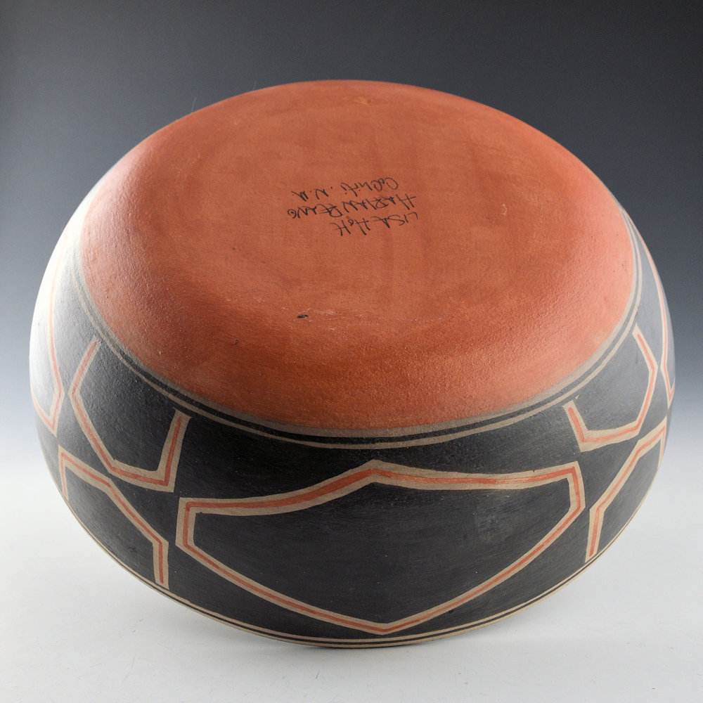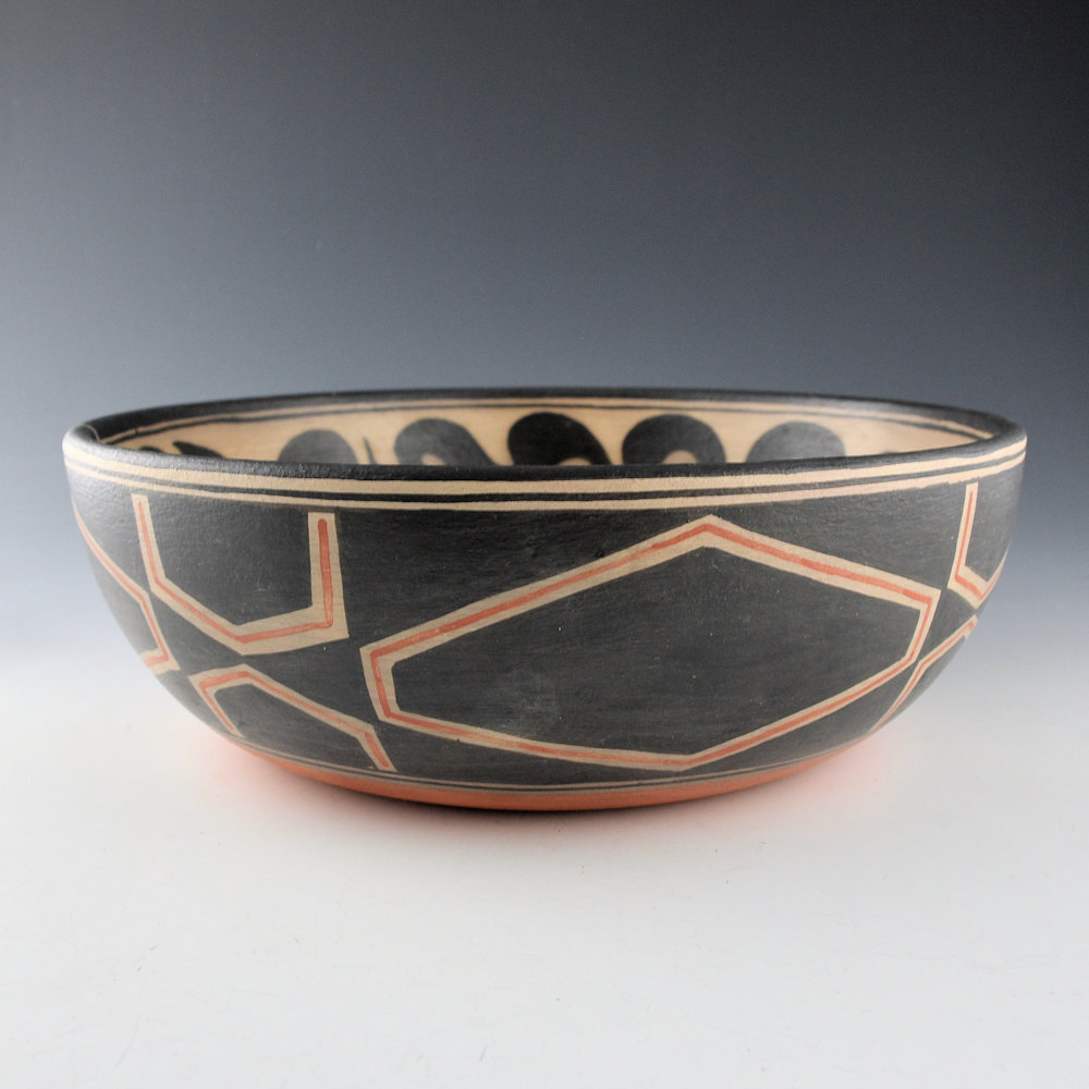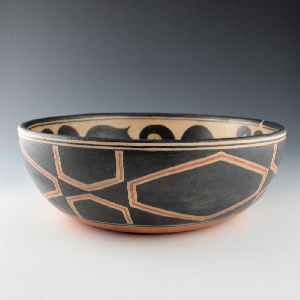 This is a classic open bowl by Lisa Holt and Harlan Reano.  They make an amazing team, working to create innovative pottery using traditional techniques.  Lisa makes the pottery, and it is painted by Harlan.  This open bowl has stylized clouds in the center.  On the exterior are traditional Santo Domingo Pueblo geometric shapes.  Note how they are each outlined in red. The materials are all traditional as the red and cream are both native clays while the black is wild spinach (a plant). The bowl was traditionally fired outdoors.  It is signed on the bottom, “Lisa Holt & Harlan Reano”.   Interestingly, I judged their pottery the first year they entered at Santa Fe Indian Market and it has been exciting to watch them evolve in shapes and designs over the years.   It is in excellent condition with no chips, cracks, restoration, or repair.