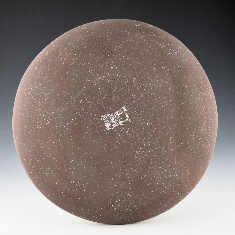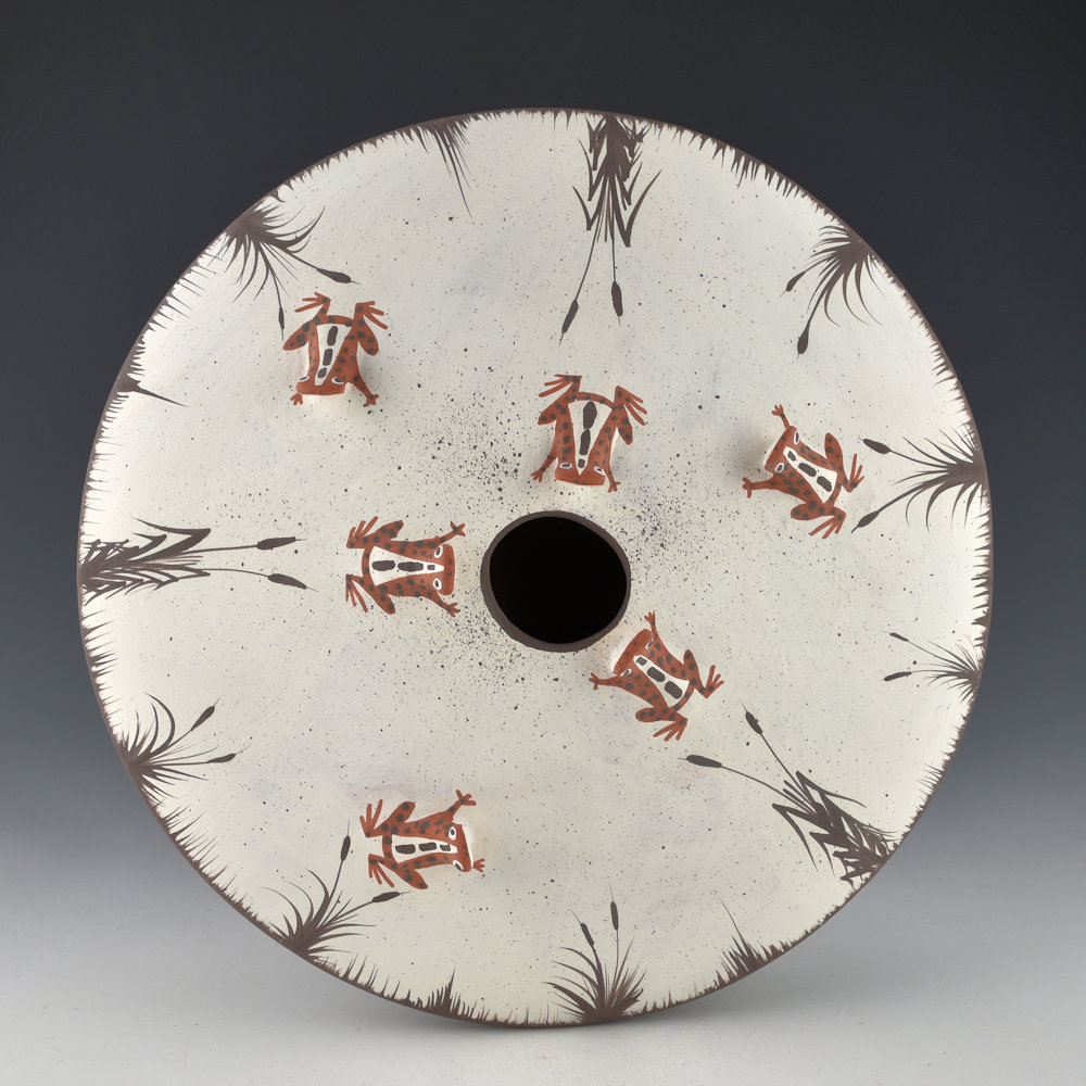 Marcus Homer (b. 1971) began making pottery at age 7. He is known for his fetish, cloud, and cornmeal bowls. This is wide shoulder bowl that is very flat in shape. The top has five frogs in relief. They are painted red and white. There are painted plant designs around the edge of the piece. The bowl is signed on the bottom, “M. Homer”. It is in excellent condition with no chips, cracks, restoration, or repair.