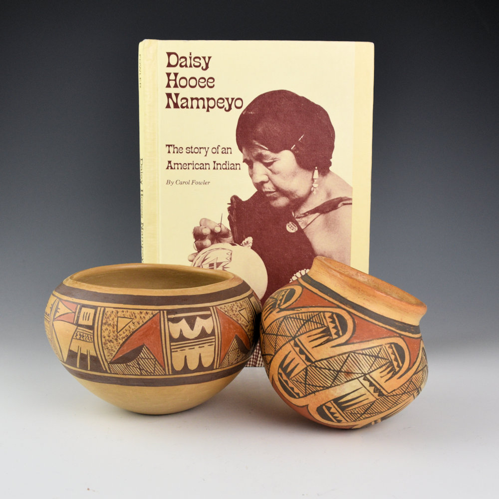 Daisy Hooee Nampeyo holding a piece of her pottery with her "Tobacco Leaf" signature. She is sitting next to her grandmother, Nampeyo of Hano.[/caption]