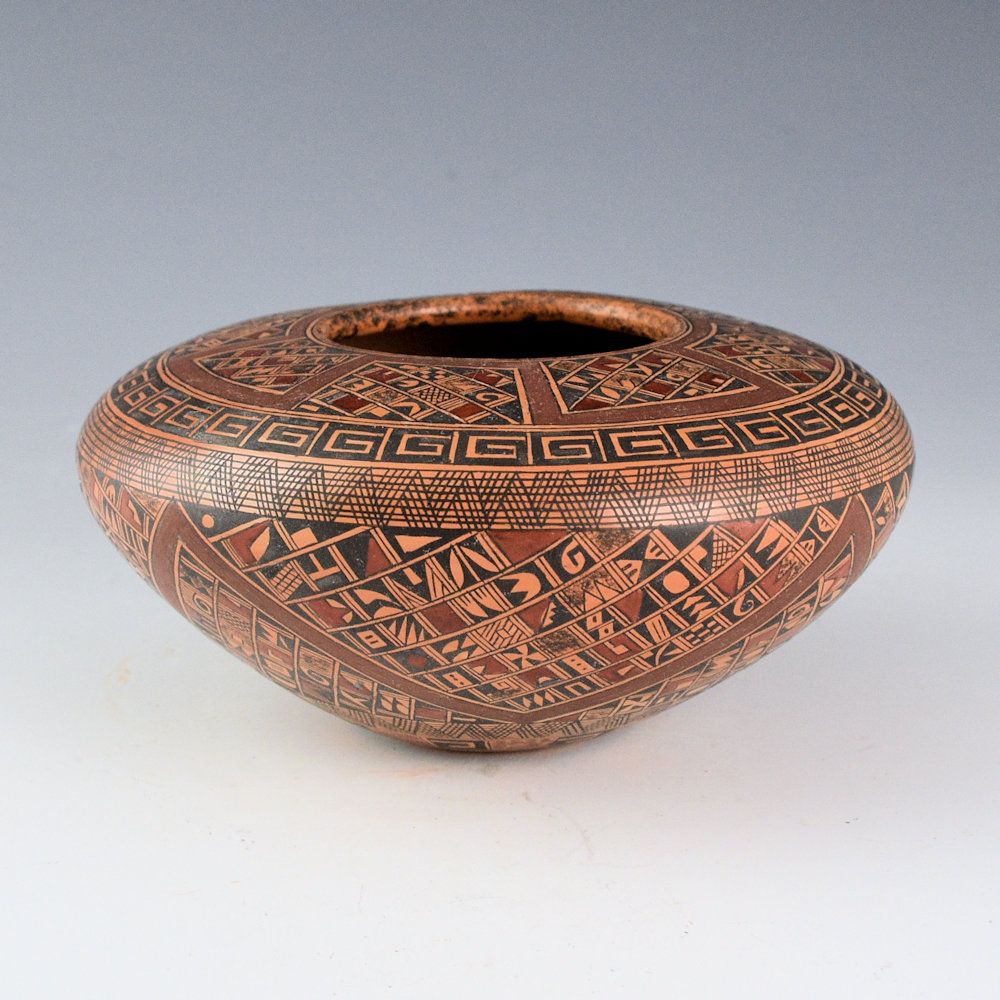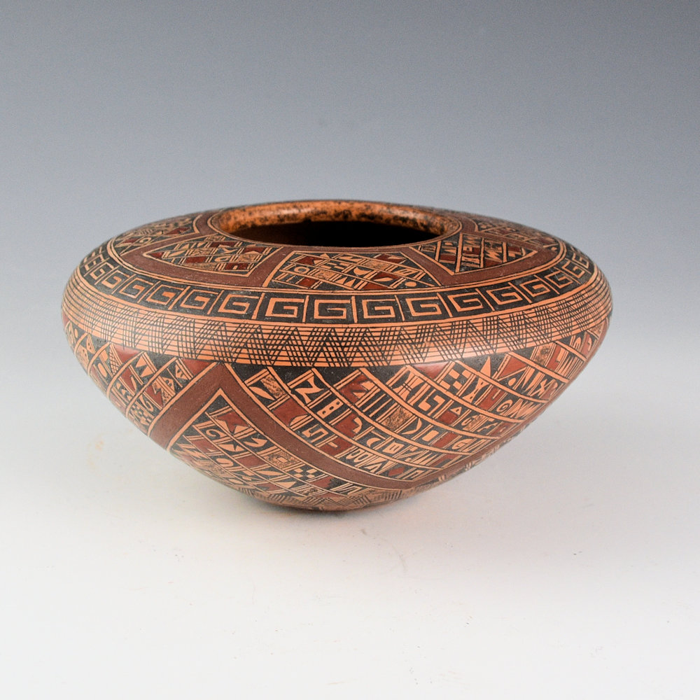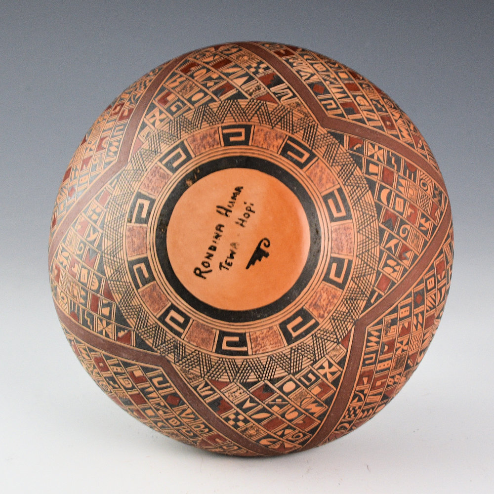 Rondina Huma has certainly been one of the most influential Hopi potters working today. Since her two-time “Best of Show” awards at Santa Fe Indian Market, her tight style and intricately painted pottery have changed the face of contemporary Hopi pottery. Each piece is coil-built, fully stone-polished, and painted with native clays and bee-weed (black), and native fired. This fully painted bowl is from the early 2000’s. Rondina said of this style of her pottery: