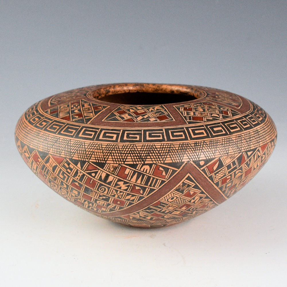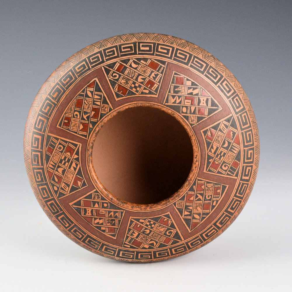 The bowl has a wide shoulder and flat top. The top has a “key hole” design in burgundy clay, which is filled in with small shard squares. There is a cloud and mountain design around the shoulder. Below the shoulder, there are triangular mountain designs in deep burgundy red. These sections have flowing places with squares of shard designs. Note how they are painted at an angle! All the deep red areas are also stone-polished. This bowl has an amazing amount of line work! The early 2000s were some of Rondina’s most intricate pieces, and this is certainly one of them. It is tightly painted and striking in person! It was traditionally fired to create the blushes on the surface. The bowl is signed on the bottom in the clay, “Rondina Huma”. It is in excellent condition with no chips, cracks, restoration, or repair. A great-sized piece with exceptional painting!