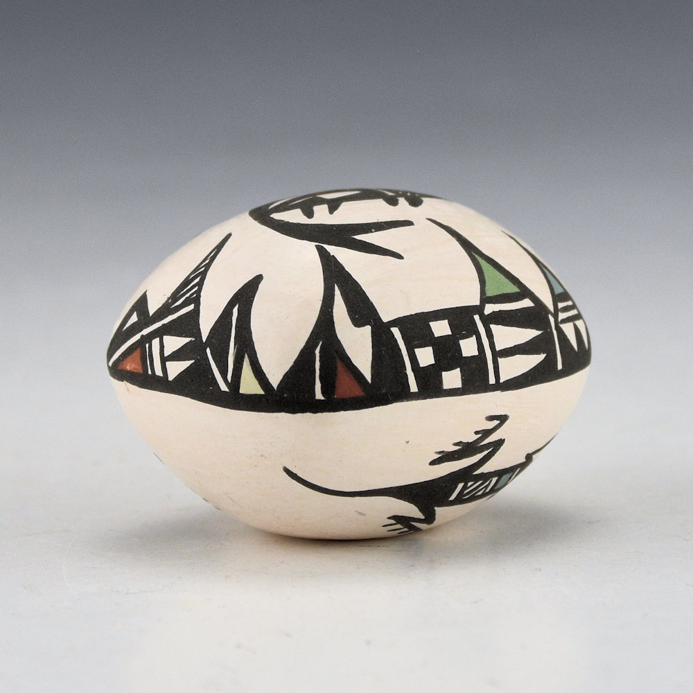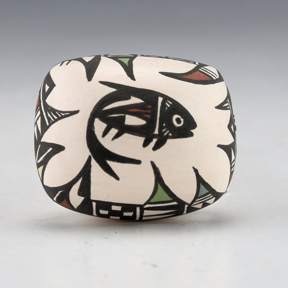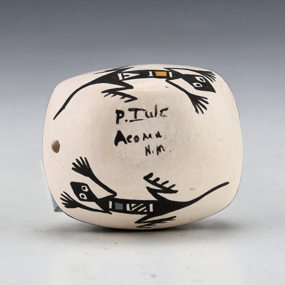 This is an unusual seedpot by Pat Iule (b. 1956). She began making pottery in 1984 and is a daughter of Robert and Pauline Iule. This seedpot is coil-built and painted with bee-weed (black) and various clay colors. It is rectangular in shape with a Mimbres fish on top surrounded by waves. There are two Mimbres lizards painted on the bottom. It is signed on the bottom in the clay, “P. Iule”. It is in excellent condition with no chips, cracks, restoration, or repair.