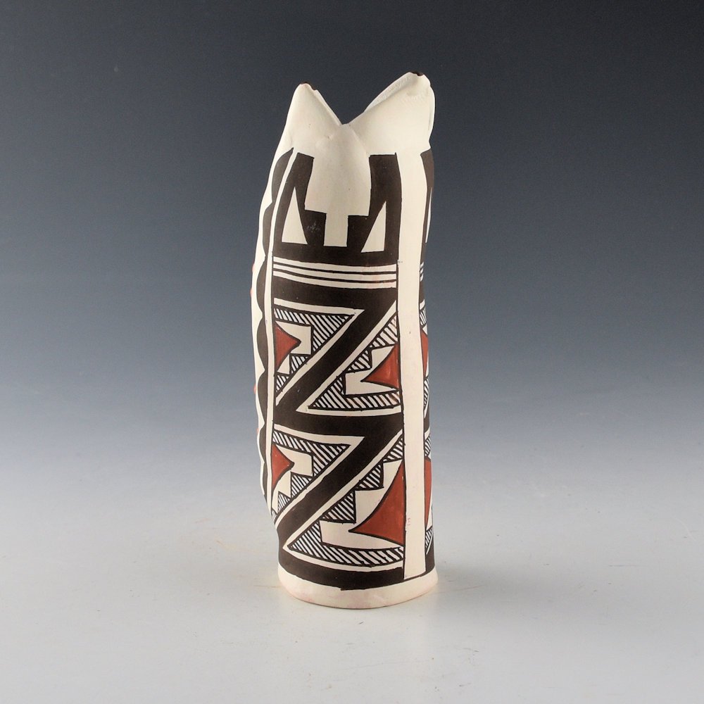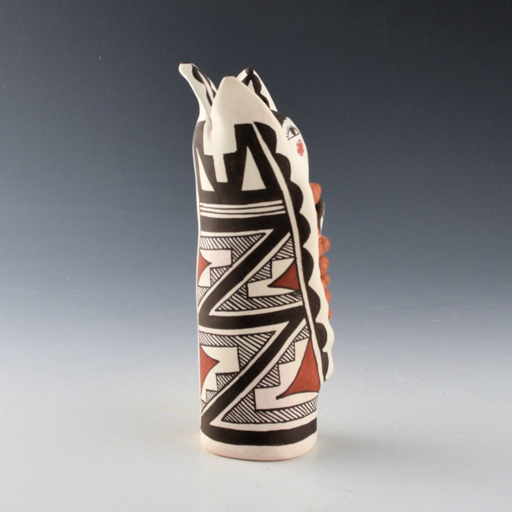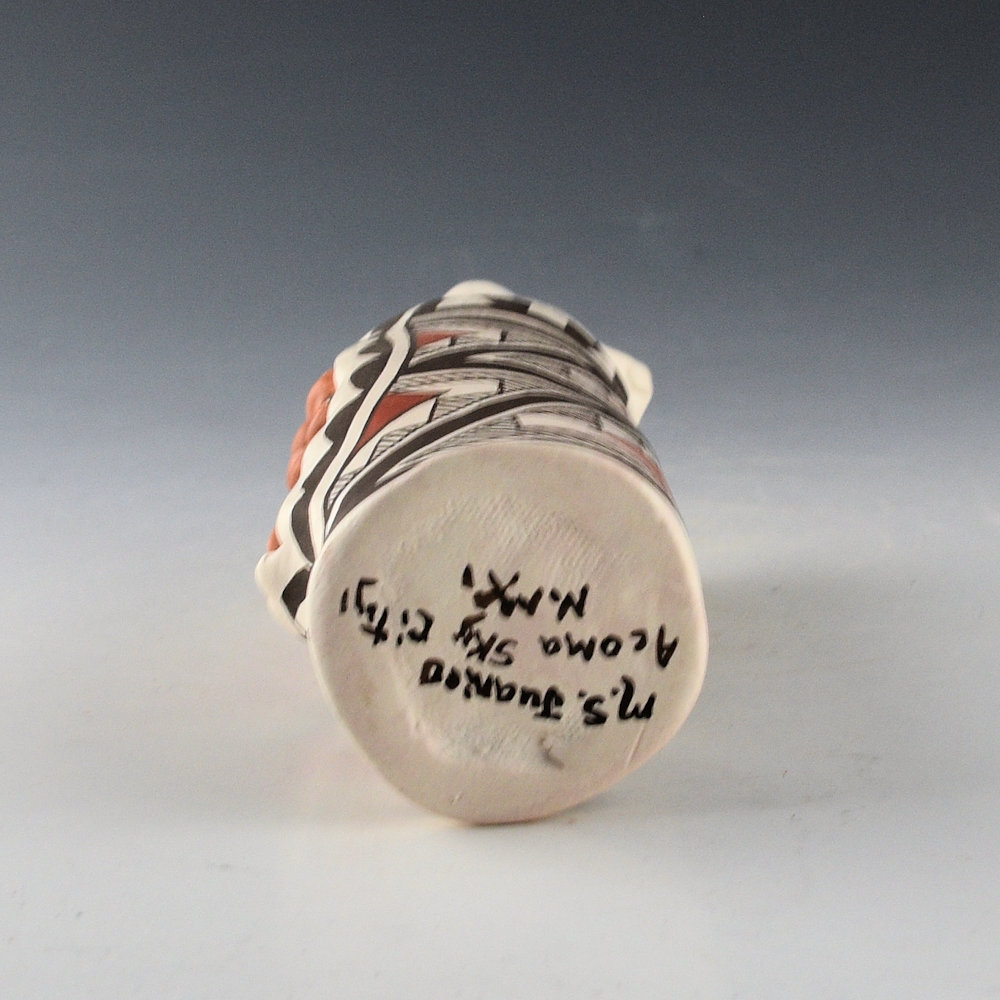 Marie Juanico (1937-2024) learned to make pottery from her mother, Dolores Sanchez (who lived to be 103!). Marie began making pottery in 1962. She is known for her innovative use of various colors of clay slips on her pottery. Her daughter, Delores Juanico Aragon, continues to make pieces in a similar style. This is one of her figurative pieces. It is a Corn Maiden with sculpted kernels of corn. It is also a storyteller with two children among the kernels! The “husk” of the corn is fully painted with rain and cloud designs. It is signed on the bottom, “M. S. Juanico”. It is in excellent condition with no chips, cracks, restoration or repair.