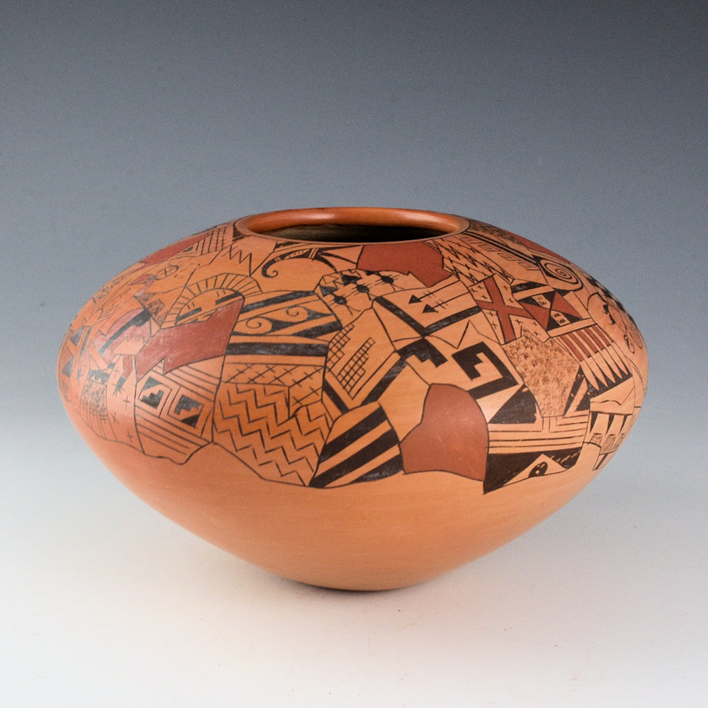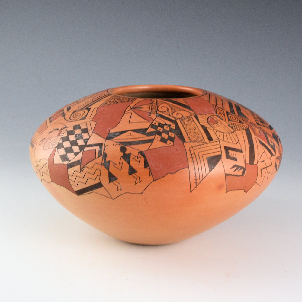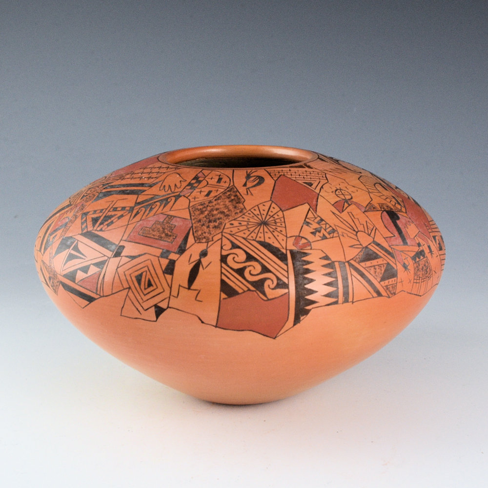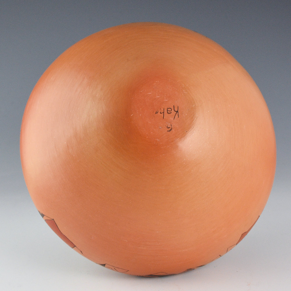Gloria Kahe (b. 1951) is Navajo and married Samuel Kahe in 1970. She learned to make pottery from her mother-in-law Marcella Kahe. She is the mother of Valerie Kahe and her sister-in-law is Karen Kahe Charley. This bowl is made from red Hopi clay. it has a classic Hopi-Tewa shape with a wide shoulder and sloping top. The area above the shoulder is fully painted. There are tightly painted interlocking shards with designs from a sun to moth and even birds. It is tightly painted and with bee-weed (black) and highlighted with additional clay slips. The jar was traditionally fired so there are light blushes on the surface. It is signed on the bottom in the clay, “G. Kahe”. It is in excellent condition with no chips, cracks, restoration, or repair.
