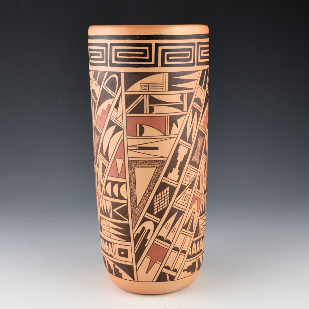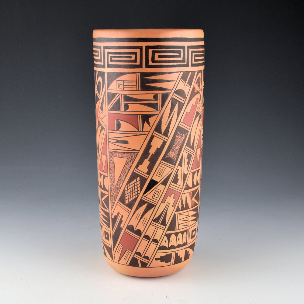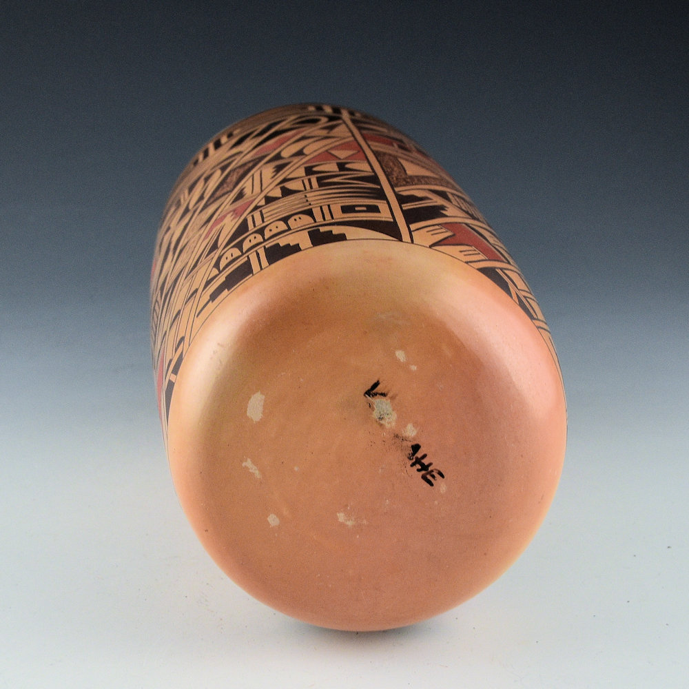 Val Kahe is a daughter of noted potter Gloria Kahe. This tall cannister is coil-built, stone-polished, and painted with bee-weed (black) and red clay slips. The shape is difficult to make and keep the sides straight and even. The entire piece (even the inside!) is fully stone polished. The designs are shard and geometric patterns, and remind me of the work of her mother, Gloria. It is highlighted with red clay slips. The piece has been traditionally fired to create fire clouds. It is signed on the bottom, “V. Kahe”. It is in very good condition with no chips, cracks, restoration, or repair.