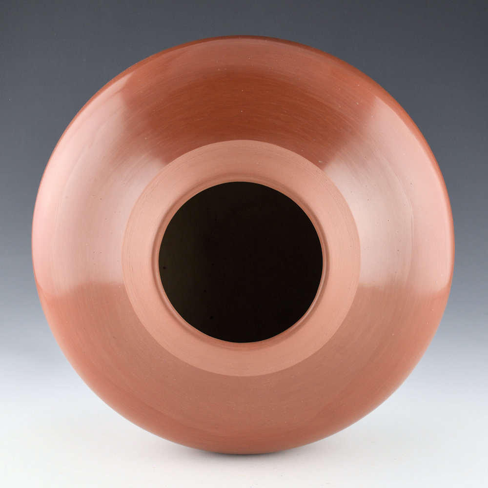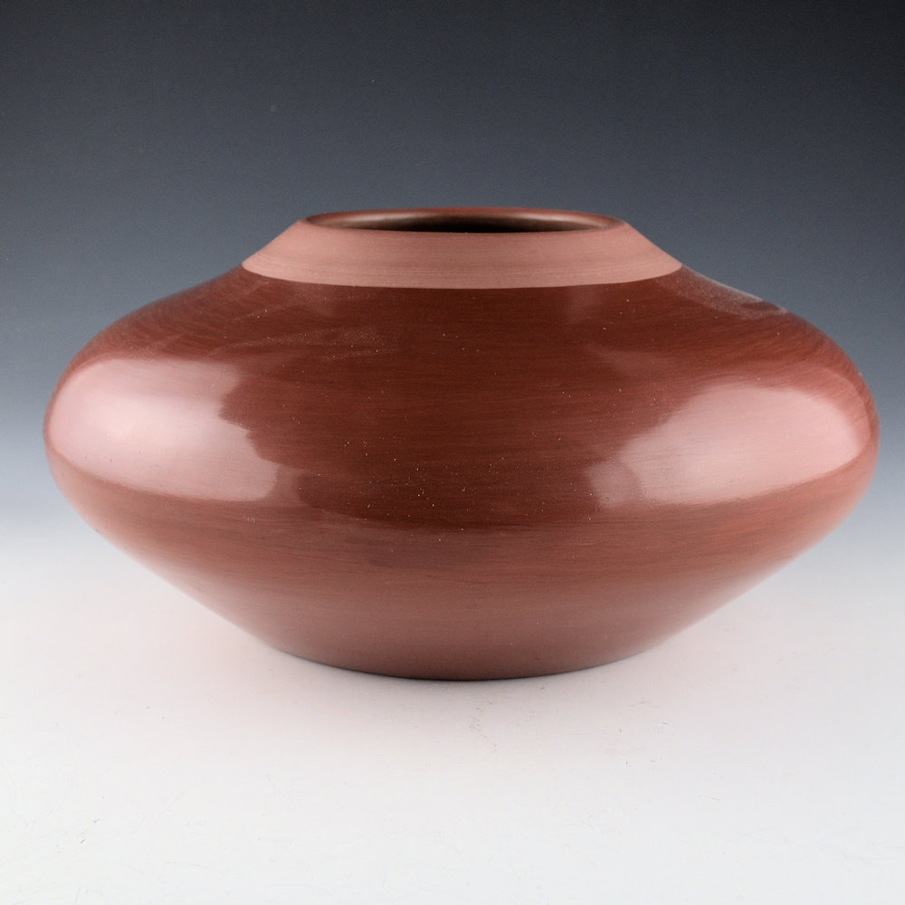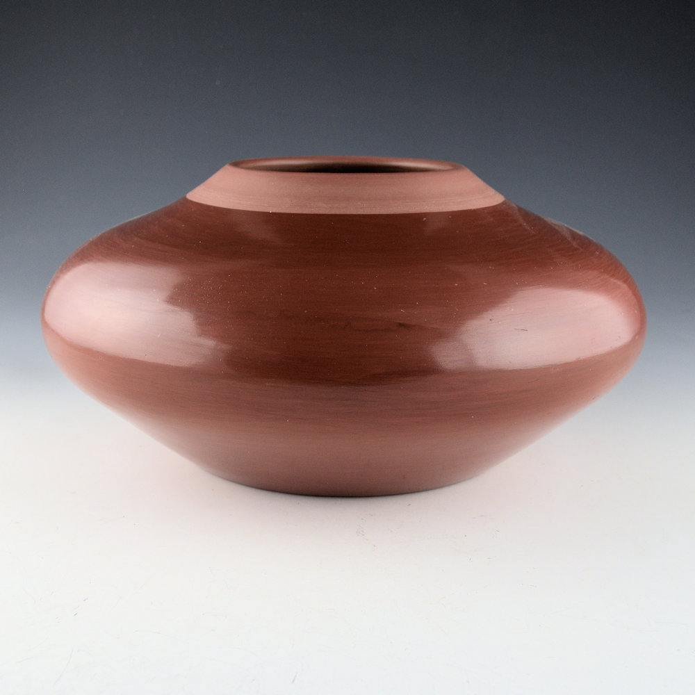This is a striking wide jar by Alton Komalestewa. It is a fully polished and fired a dark brown coloration. The jar has a classic Hopi-Sikyakti shape with wide, round shoulder The entire surface is fully polished. The neck is matte in contrast to the polished surface. The piece is simple and elegant in both form and design. The jar is signed on the bottom by Alton and he also uses a katsina face as part of the hallmark of his name. It is in excellent condition with no chips, cracks, restoration or repair.