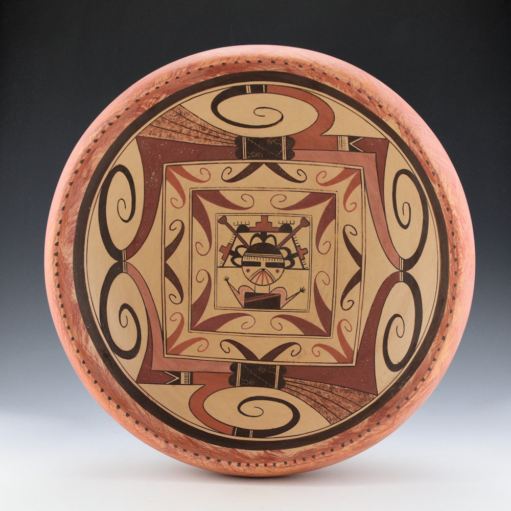 This is a classic large open bowl by Jacob Koopee. The piece is coil-built and stone-polished. It is painted with bee-weed (black) and various clay slips. The back of the bowl is paitned with the various clays in a “painterly” manner, meaning it has subtle designs but is meant to look more like having brush strokes in the clay. The center inside has a Butterfly Maiden Katsina in the center. She is surrounded by two rows of butterfly antennae designs. Along the edge are large swirling Sikyatki-style birds. The red and orange clays have mica in them, which is a later addition to his pottery. The mauve (purple color) is also a later addition to his pottery painting. The various colors and precision painting give his work a very modern, contemporary appearance. The bowl was traditionally fired to create the blushes on the surface. It is signed on the bottom with his flute player hallmark. It is in excellent condition with no chips, cracks, restoration, or repair.