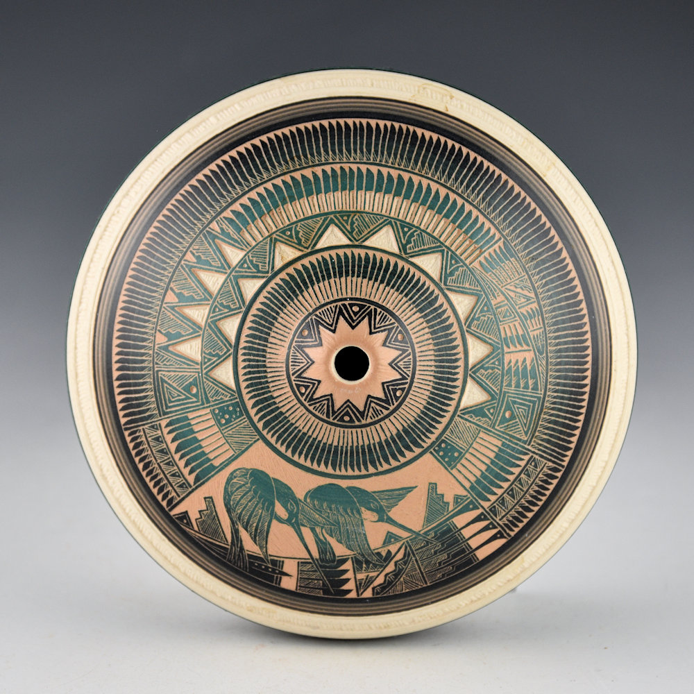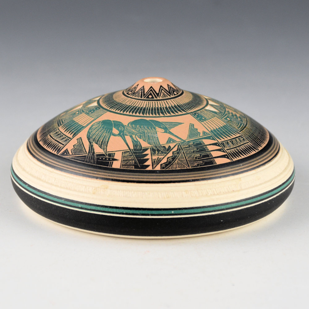 Robert (Bob) Lansing (b. 1966), Navajo is the son of noted weaver Helen Benally Lansing and Dan Lansing, a noted Navajo Medicine Man. Robert remembers his father as a “healer of minds”. Robert’s work is deeply influenced by his father, grandfather, and brother-in-law, William Yazzie. Yazzie, a well-known Navajo potter, taught Bob the skills of carving pottery.  This piece is made from White Haggie porcelain from Salt Lake City and etched with designs.  There are two hummingbirds etched into the clay.  They are surrounded by bands of feathers around the shoulder.  It is very intricately designed.  It is signed, “Bob Lansing”.  The jar is in excellent condition with no chips, cracks, restoration, or repair.