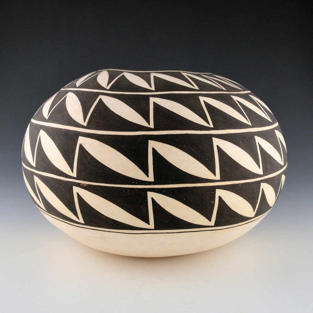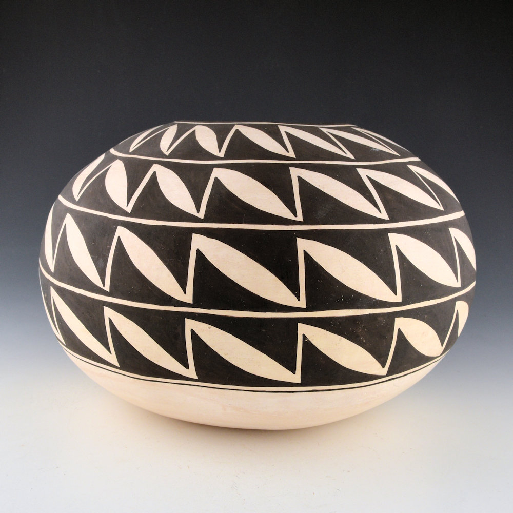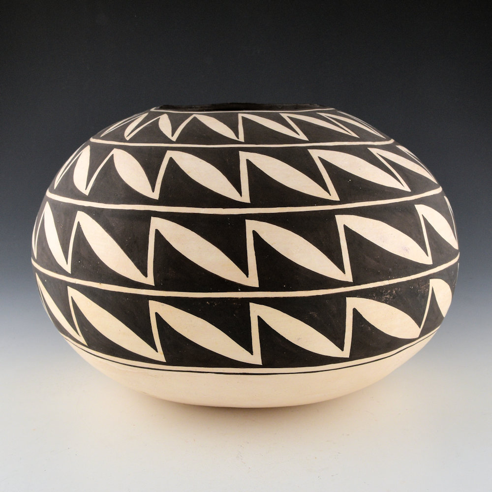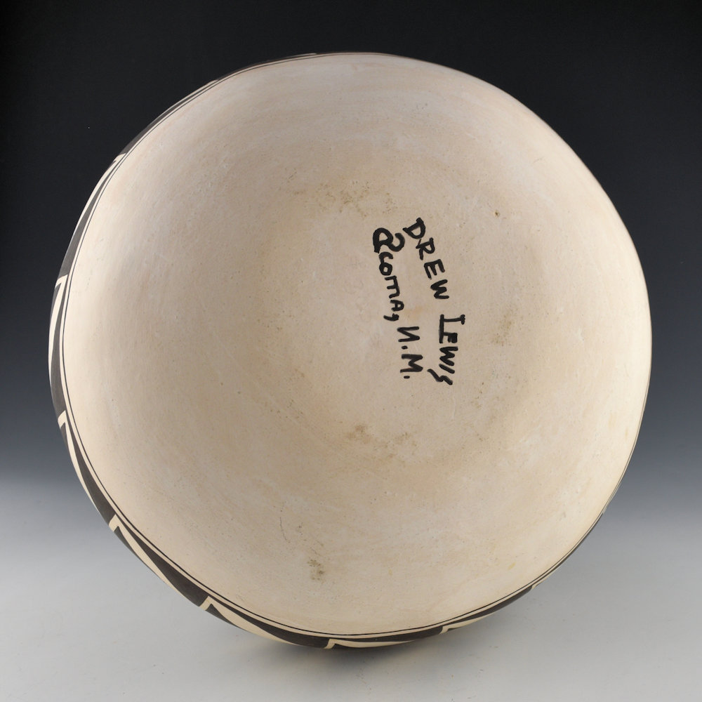 Drew Lewis was a son of noted potter Lucy M. Lewis. This is a large, coil-built bowl made from native clay. The bowl is round in shape. It is paitned with bee-weed (black). There are four rows of interlocking leaf designs. Each leaf connects to the one next to it. It is a design made famous by his mother. The piece is signed on the bottom, “Drew Lewis”. It is in excellent condition with no chips, cracks, restoration or repair. It is not often that we see pieces by Drew, especially in this larger size!