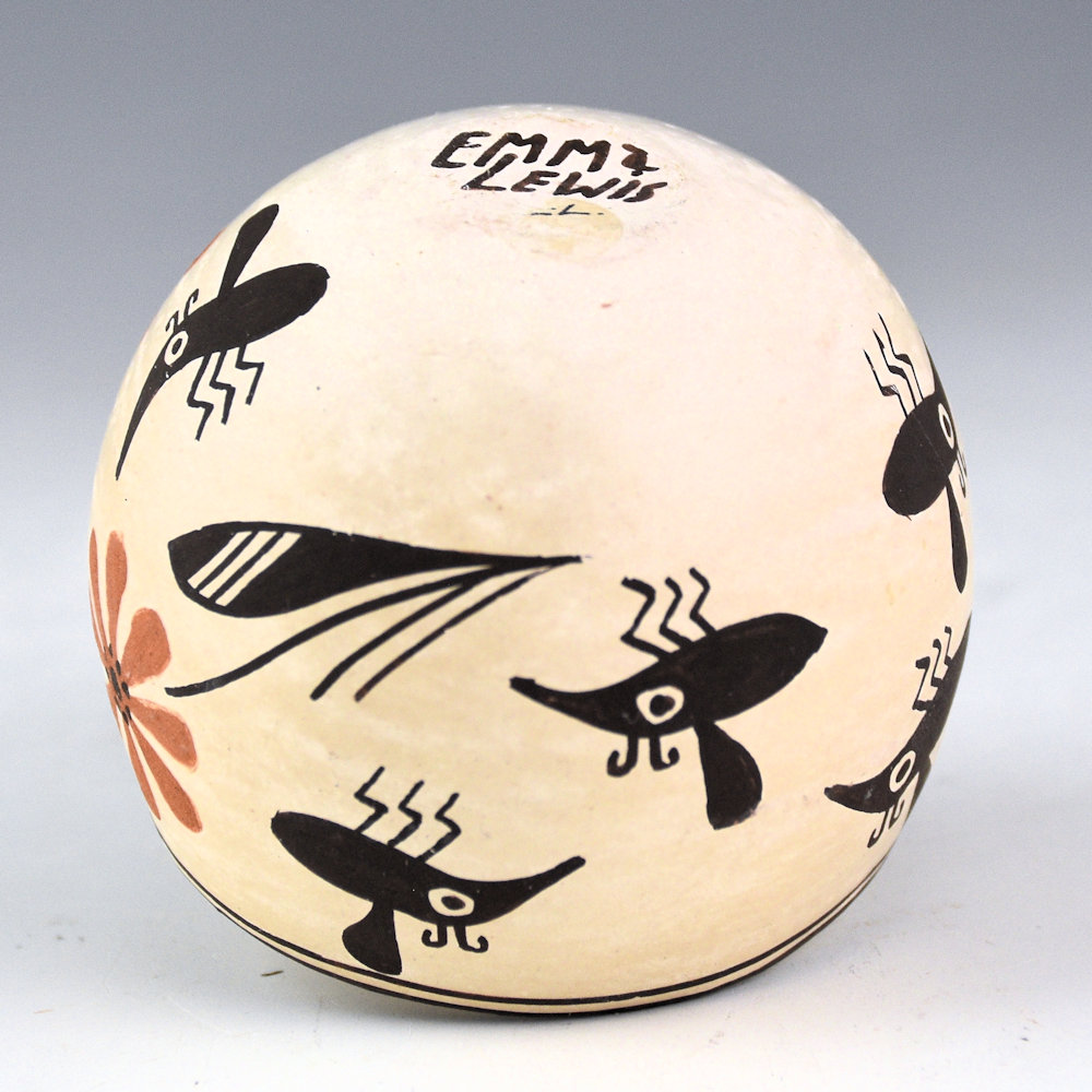 Emma Lewis-Mitchell is a daughter of renowned potter Lucy M. Lewis. Her sisters, Dolores and Carmel, are also well known potters. Emma is known for her use of classic shapes and tightly painted designs. Emma has won numerous awards for her pottery and continues the legacy of her mother's traditional imagery on her pottery.
