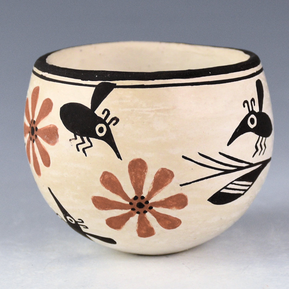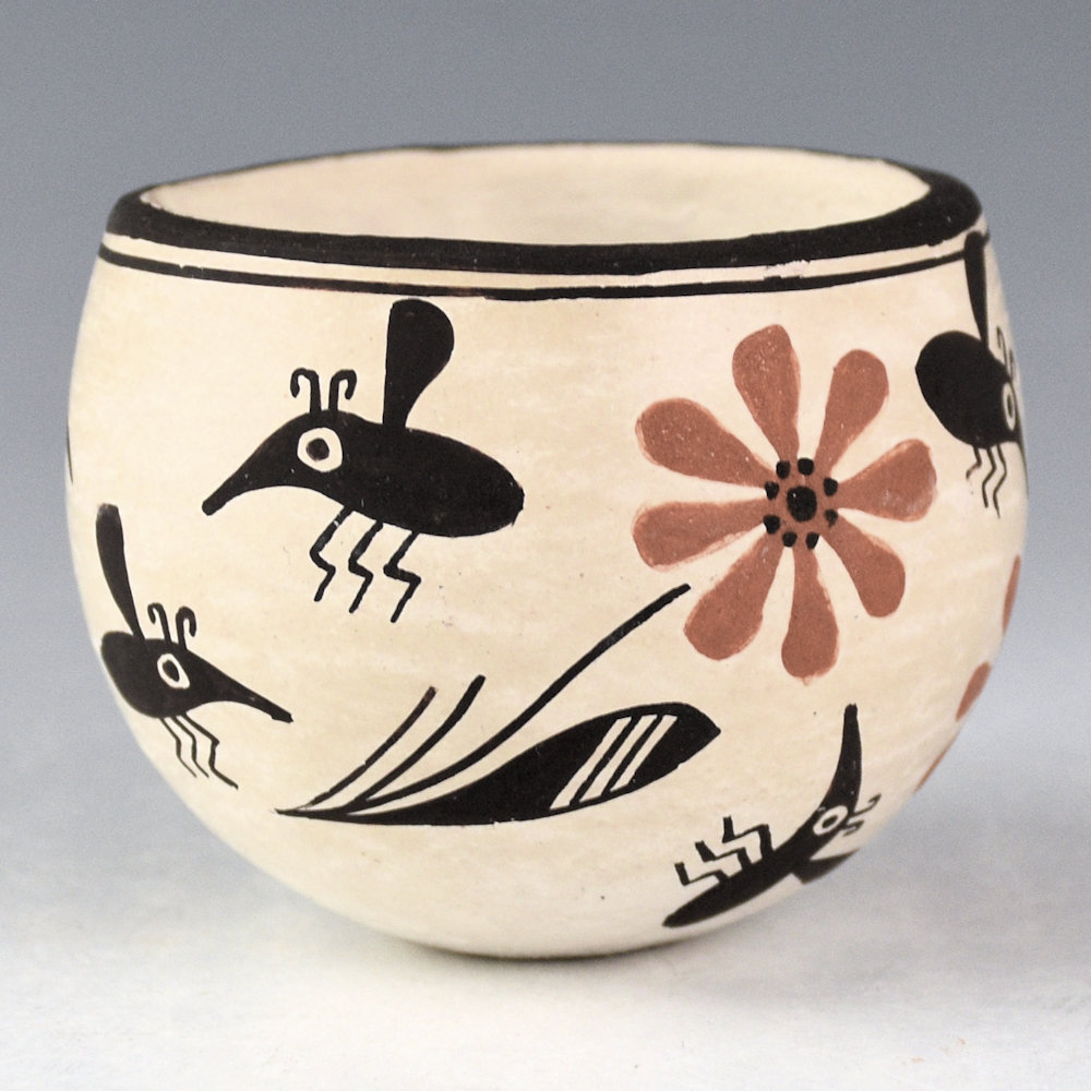Emma Lewis was a daughter of noted potter Lucy M. Lewis. This is a classic, thin-walled bowl that is coil-built and painted with bee-weed. The bowl has a round shape. There are Mimbres bees along with flowers. It is a charming design used on the piece. It is signed, “Emma Lewis”. It is in excellent condition with no chips, cracks, restoration, or repair.