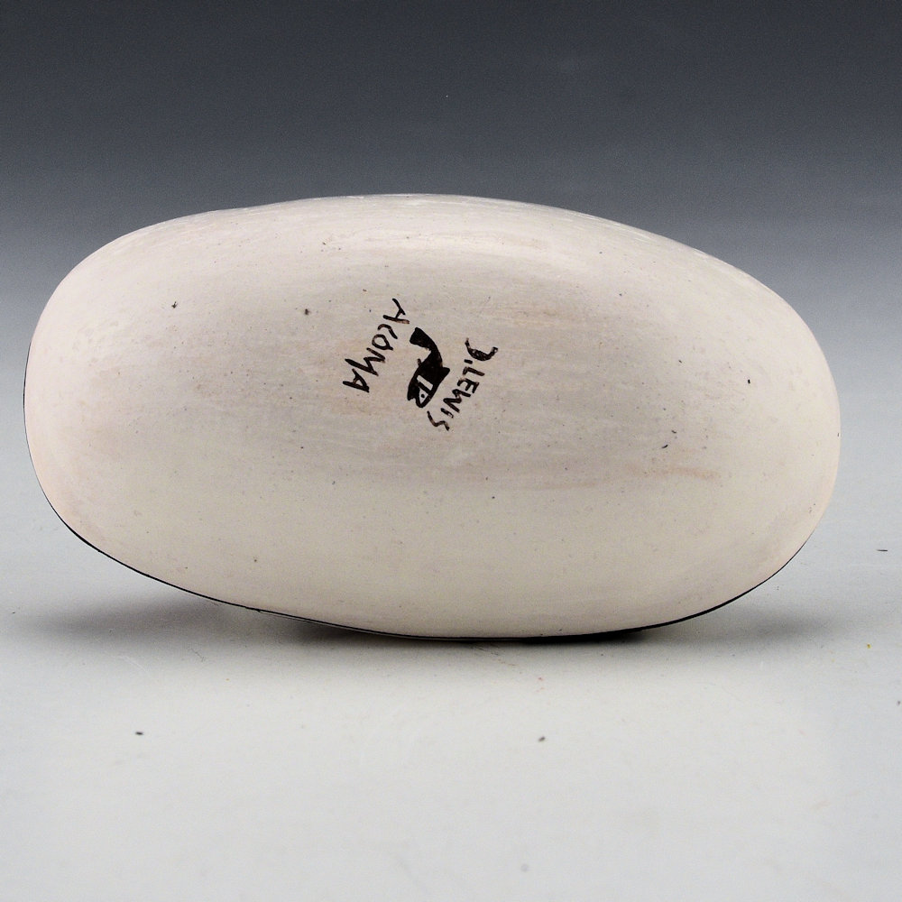 Diane Lewis-Garcia is known for her tightly painted miniature pottery.  This is one of her very intricately painted seedpots that is oval in shape.  The top is painted with a variety of Acoma designs combined with a Mimbres lizard, a Mimbres bee, a Crane and fish, along with a Pueblo flute player.  The piece is painted with bee-weed (black) and a variety of colors of natural clay slips.   The coloration and detail create a very striking piece!  It is signed on the bottom, “D. Lewis”.  It is in excellent condition with no chips, cracks, restoration, or repair.