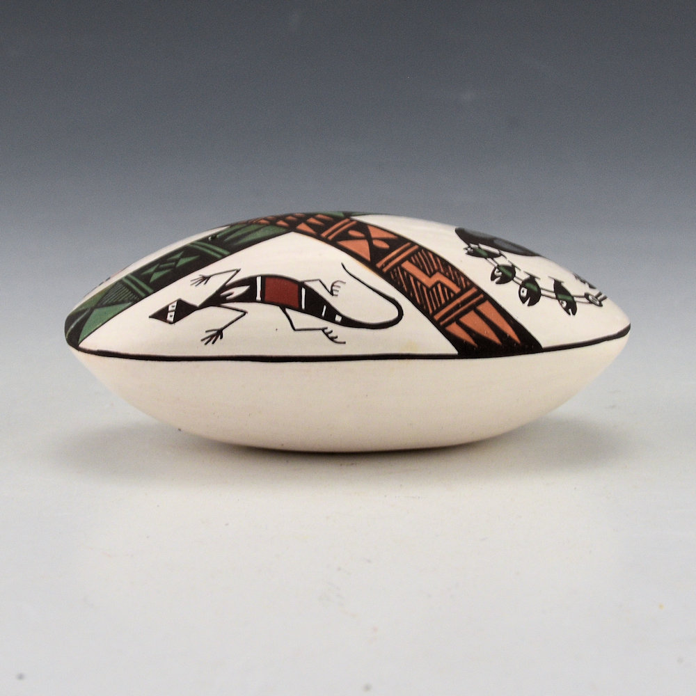 Lewis-Garcia, Diane – Mulit-Color Oval Seedpot with Lizard, Flute Player, Bird and Bee