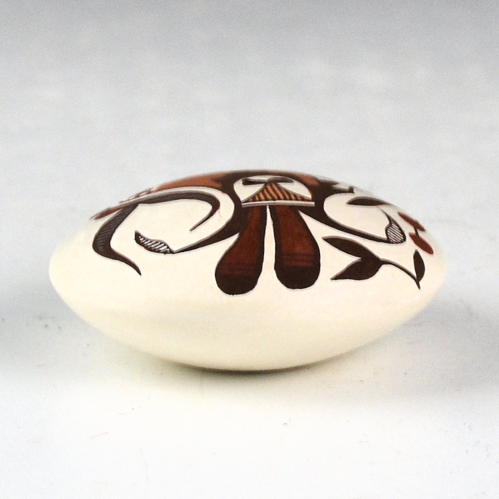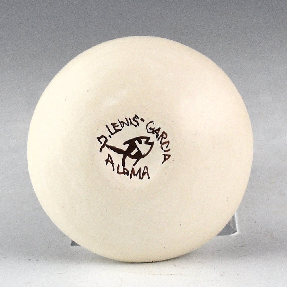 Diane Lewis-Garcia is known for her tightly painted miniature pottery. This is an intricately designed seedpot that is painted with bee-weed (black) and clay slips. There is an Acoma bird (probably a parrot) painted on the top. The colors are all derived from native clays and add to the impact of the design. It is signed on the bottom, “D. Lewis-Garcia”.
