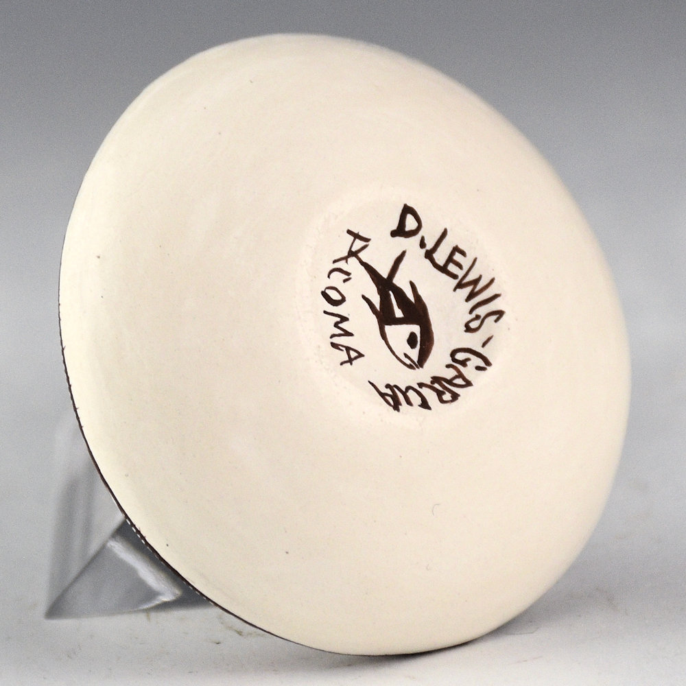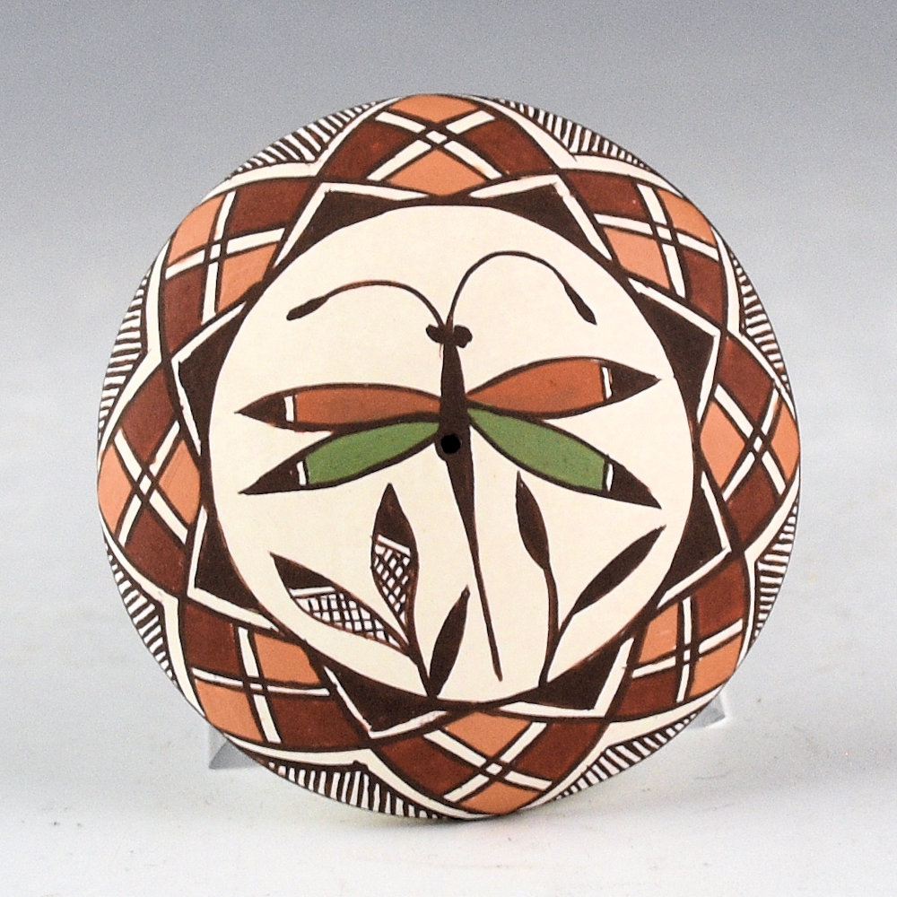 Diane Lewis-Garcia is known for her tightly painted miniature pottery. This is an intricately designed seedpot that is painted with bee-weed (black) and clay slips. There is a dragonfly in the center. It is surrounded by a star design. The colors are all derived from native clays and add to the impact of the design. It is signed on the bottom, “D. Lewis-Garcia”.
