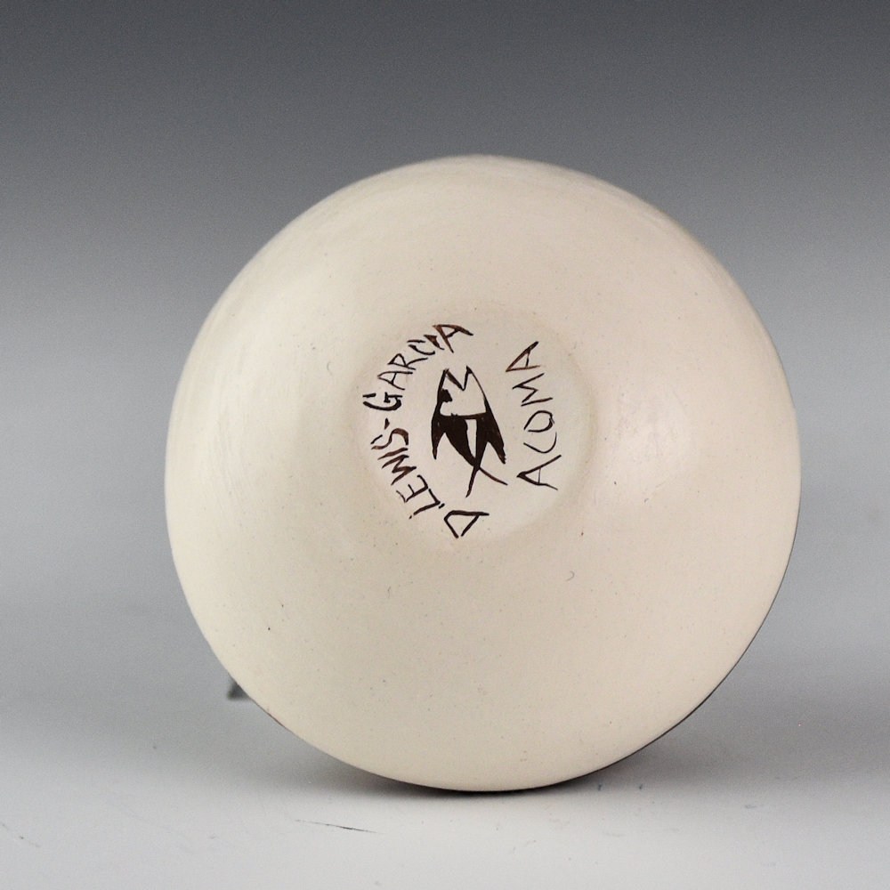 Diane Lewis-Garcia is known for her tightly painted miniature pottery. This is an intricately designed seedpot that is painted with bee-weed (black) and clay slips. There is a dragonfly and butterfly on two sides of the piece. They are separated by colorful butterfly wing designs. The colors are all derived from native clays and add to the impact of the design. It is signed on the bottom, “D. Lewis-Garcia”.