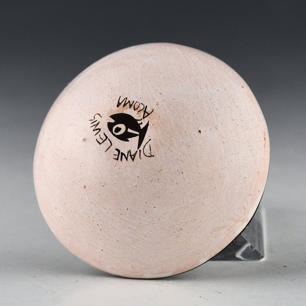 Diane Lewis-Garcia is known for her tightly painted miniature pottery.  This is an intricately designed seedpot that is painted with bee-weed (black) and clay slips.  There is a Flute Player and quail in the center.  It is surrounded by swirling mountain designs.  The colors are all derived from native clays and add to the impact of the design.  It is signed on the bottom, “D. Lewis-Garcia”.