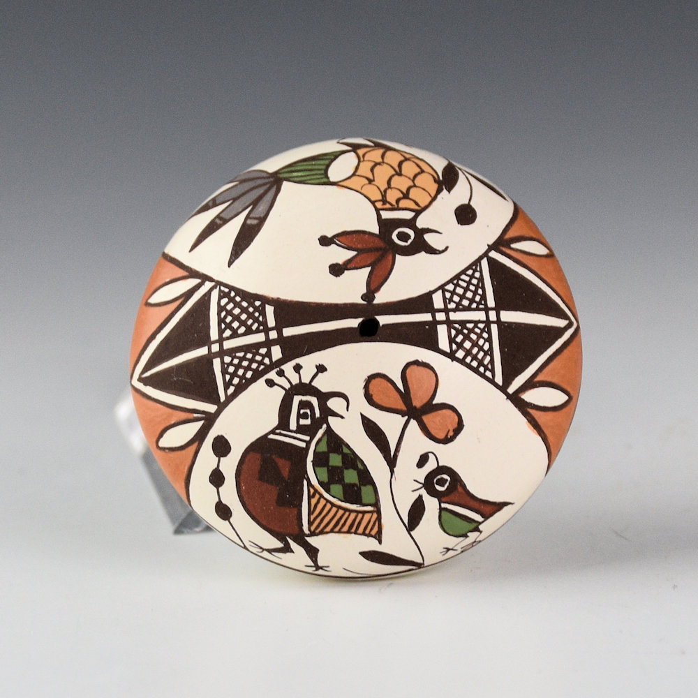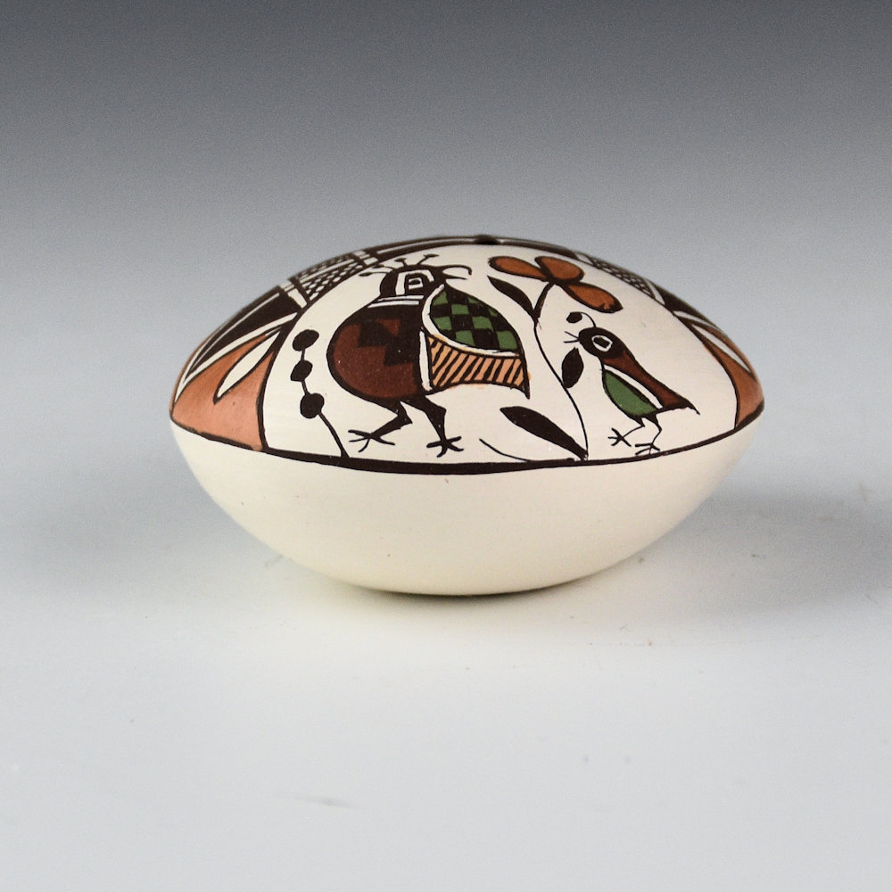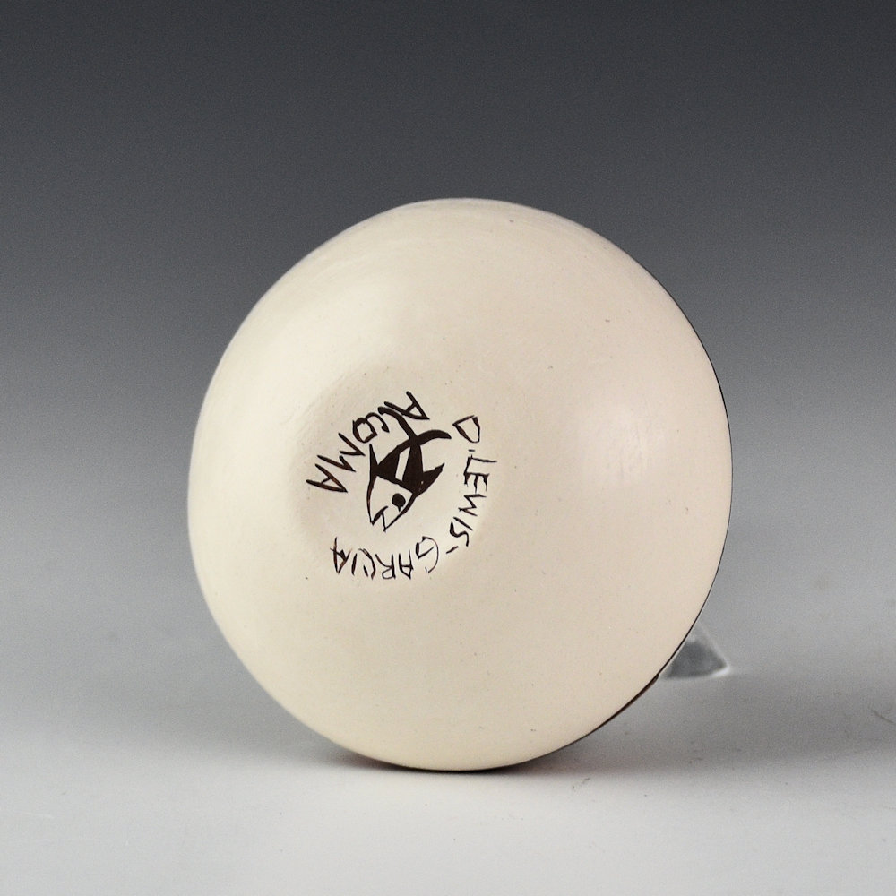 Diane Lewis-Garcia is known for her tightly painted miniature pottery. This is an intricately designed seedpot that is painted with bee-weed (black) and clay slips. There is a parrot and pair of quail on the piece. They are separated by plant designs. The colors are all derived from native clays and add to the impact of the design. It is signed on the bottom, “D. Lewis-Garcia”.