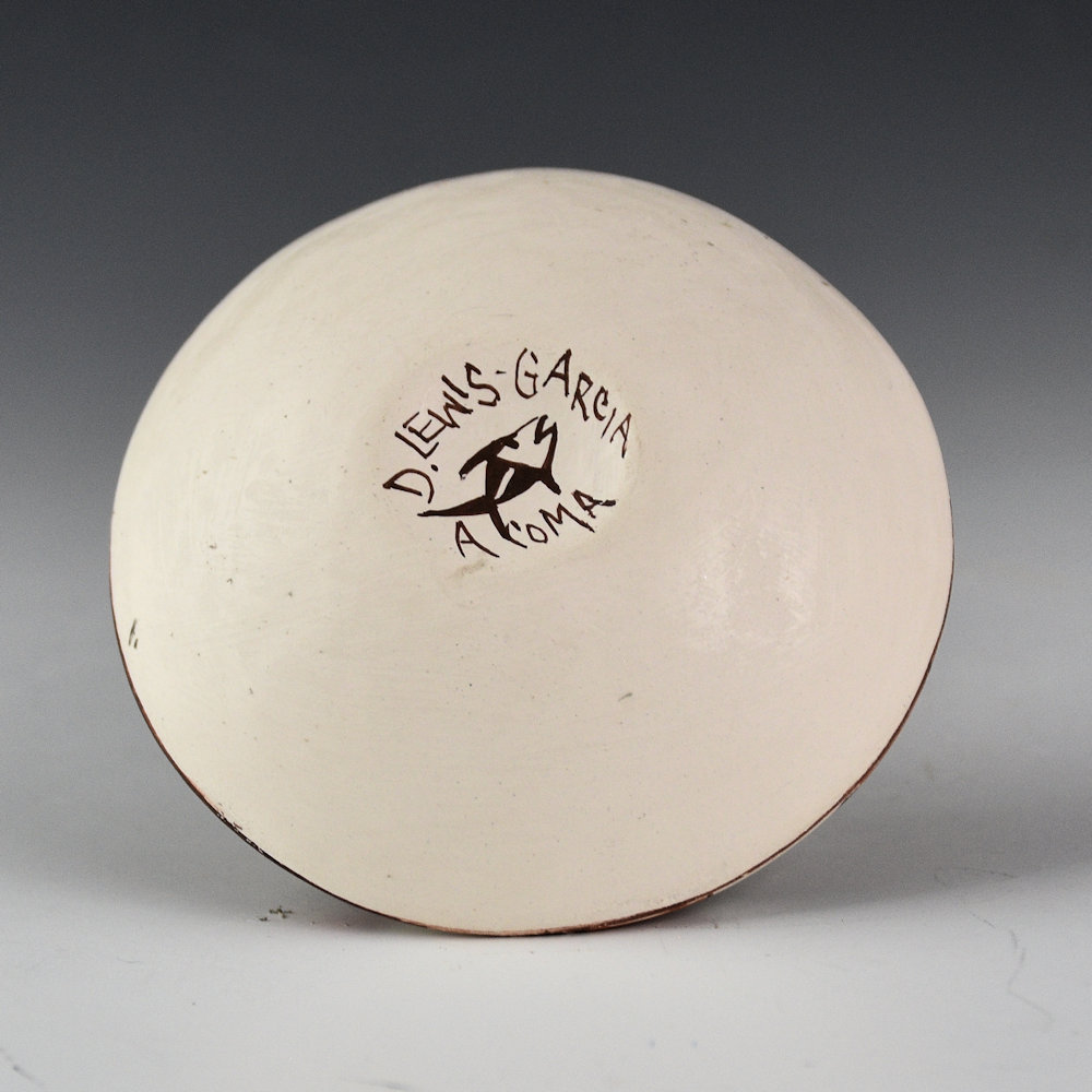Diane Lewis-Garcia is known for her tightly painted miniature pottery. This is an intricately designed seedpot that is painted with bee-weed (black) and clay slips. There is an Acoma parrot in the center. It is surrounded by rain and field designs. The colors are all derived from native clays and add to the impact of the design. It is signed on the bottom, “D. Lewis-Garcia”.