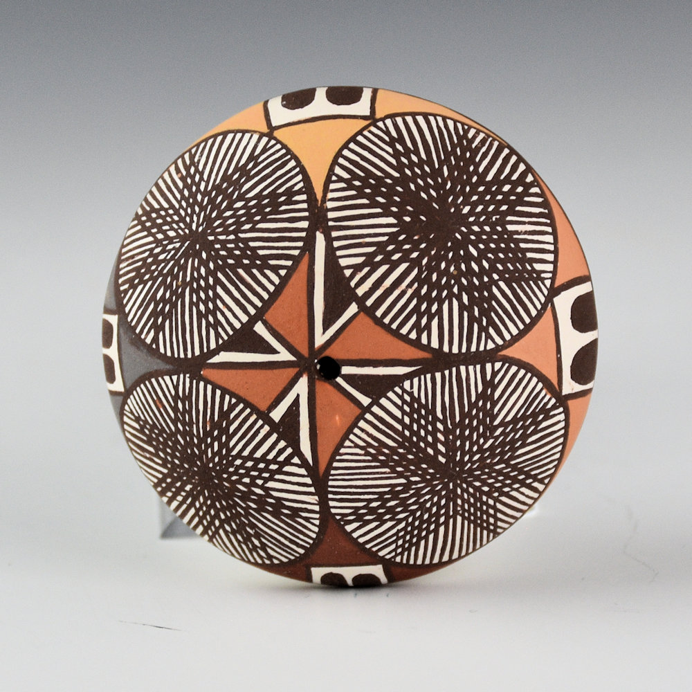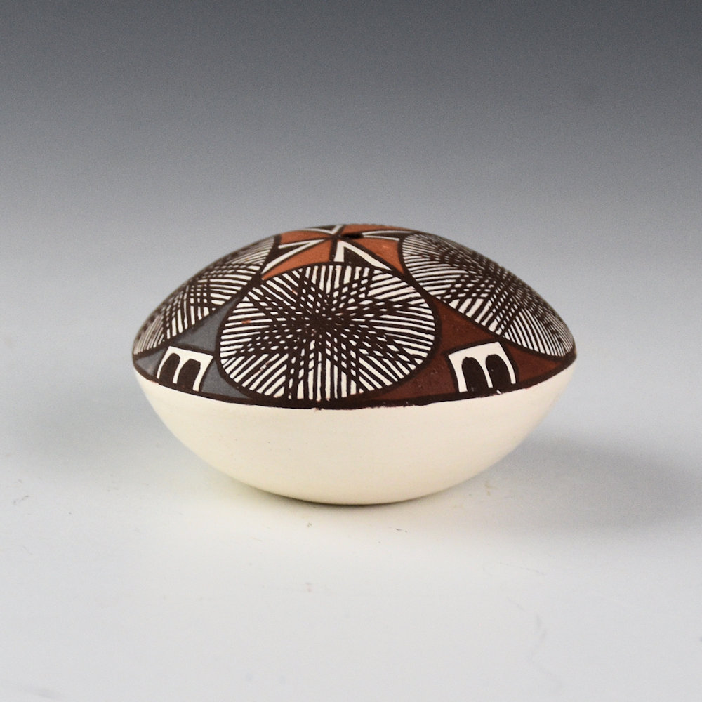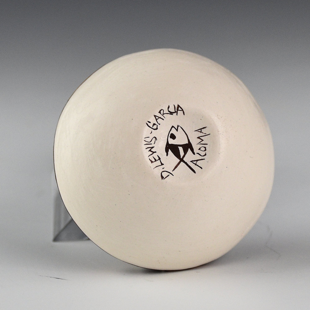 Diane Lewis-Garcia is known for her tightly painted miniature pottery. This is an intricately designed seedpot that is painted with bee-weed (black) and clay slips. There are four fine-line starbursts on the top of the piece. They are surrounded by colorful clouds and star designs. The colors are all derived from native clays and add to the impact of the design. It is signed on the bottom, “D. Lewis-Garcia”.