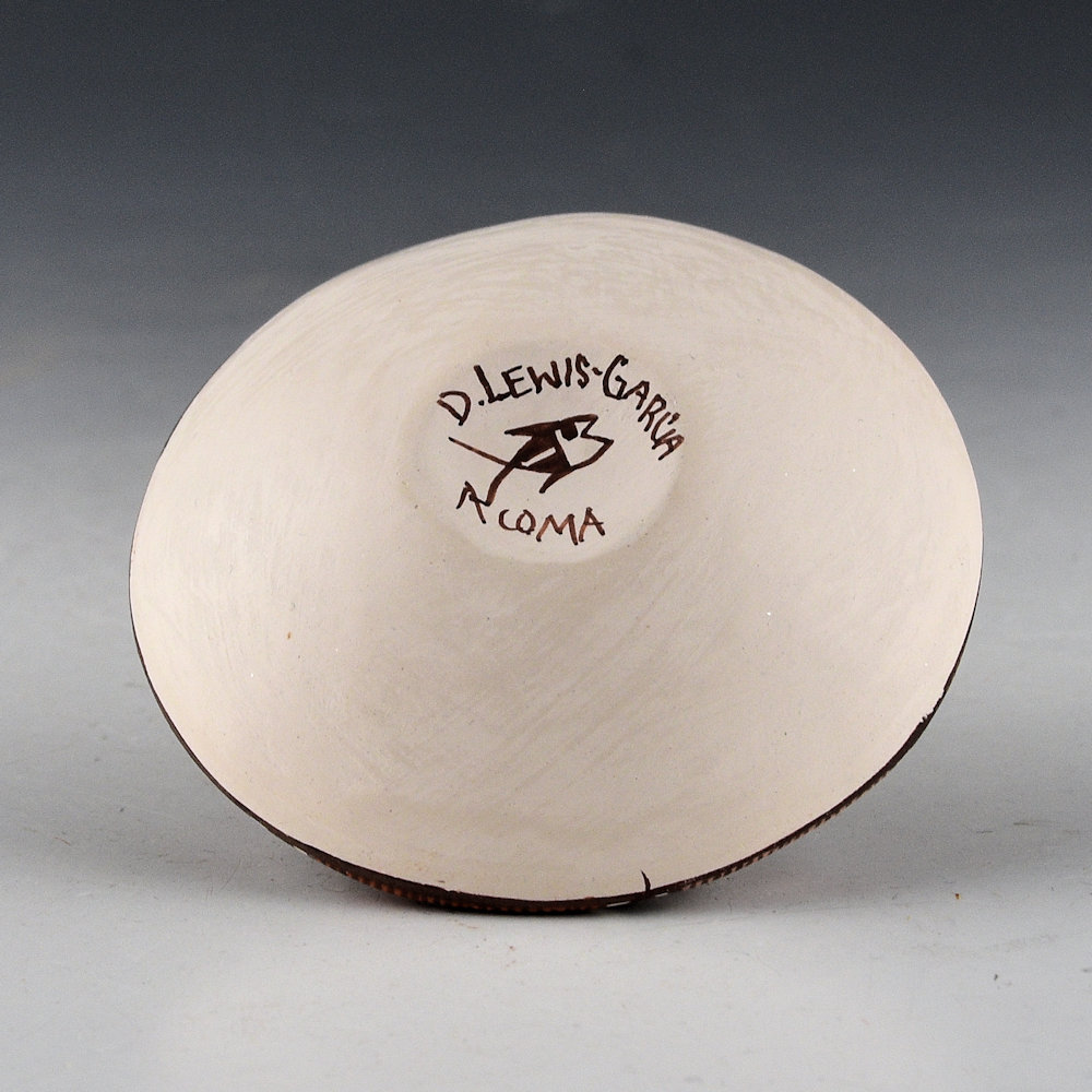 Diane Lewis-Garcia is known for her tightly painted miniature pottery. This is an intricately designed seedpot that is painted with bee-weed (black) and clay slips. There is a Mimbres turtle in the center. It is surrounded by a star pattern. The colors are all derived from native clays and add to the impact of the design. It is signed on the bottom, “D. Lewis-Garcia”.
