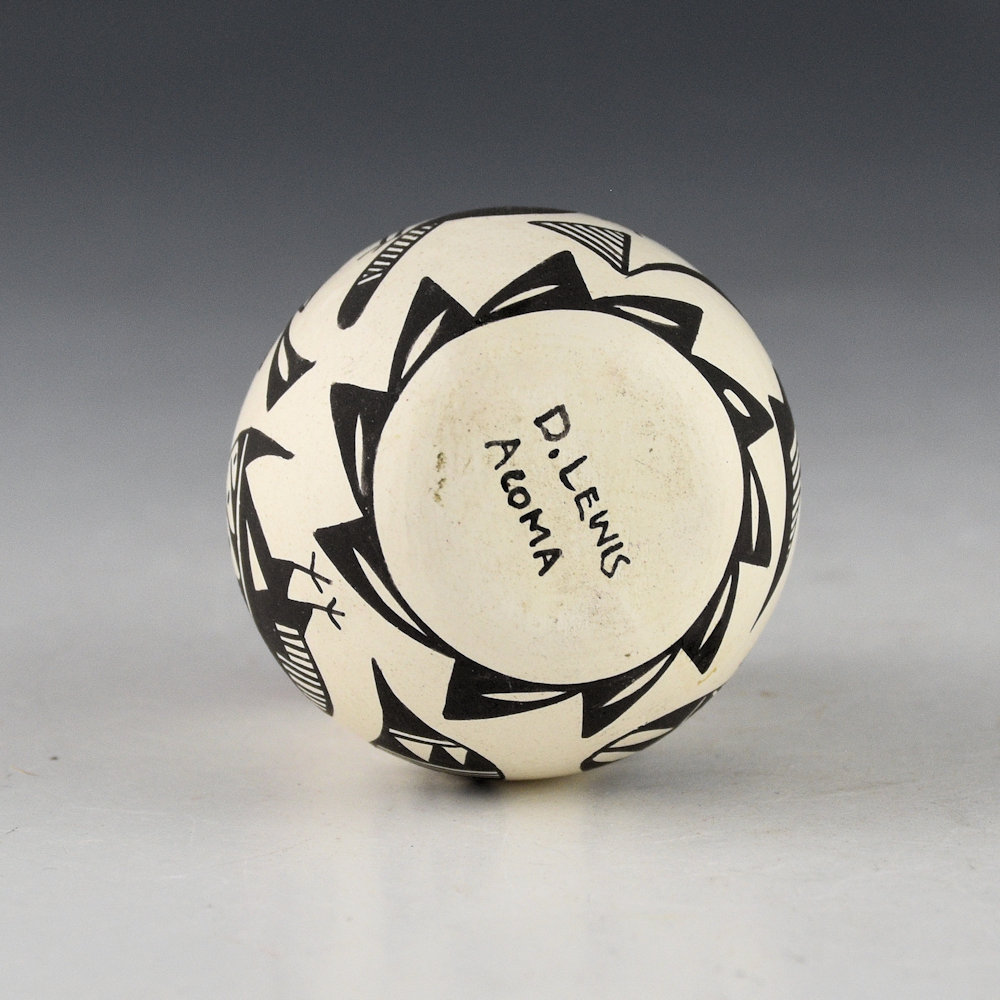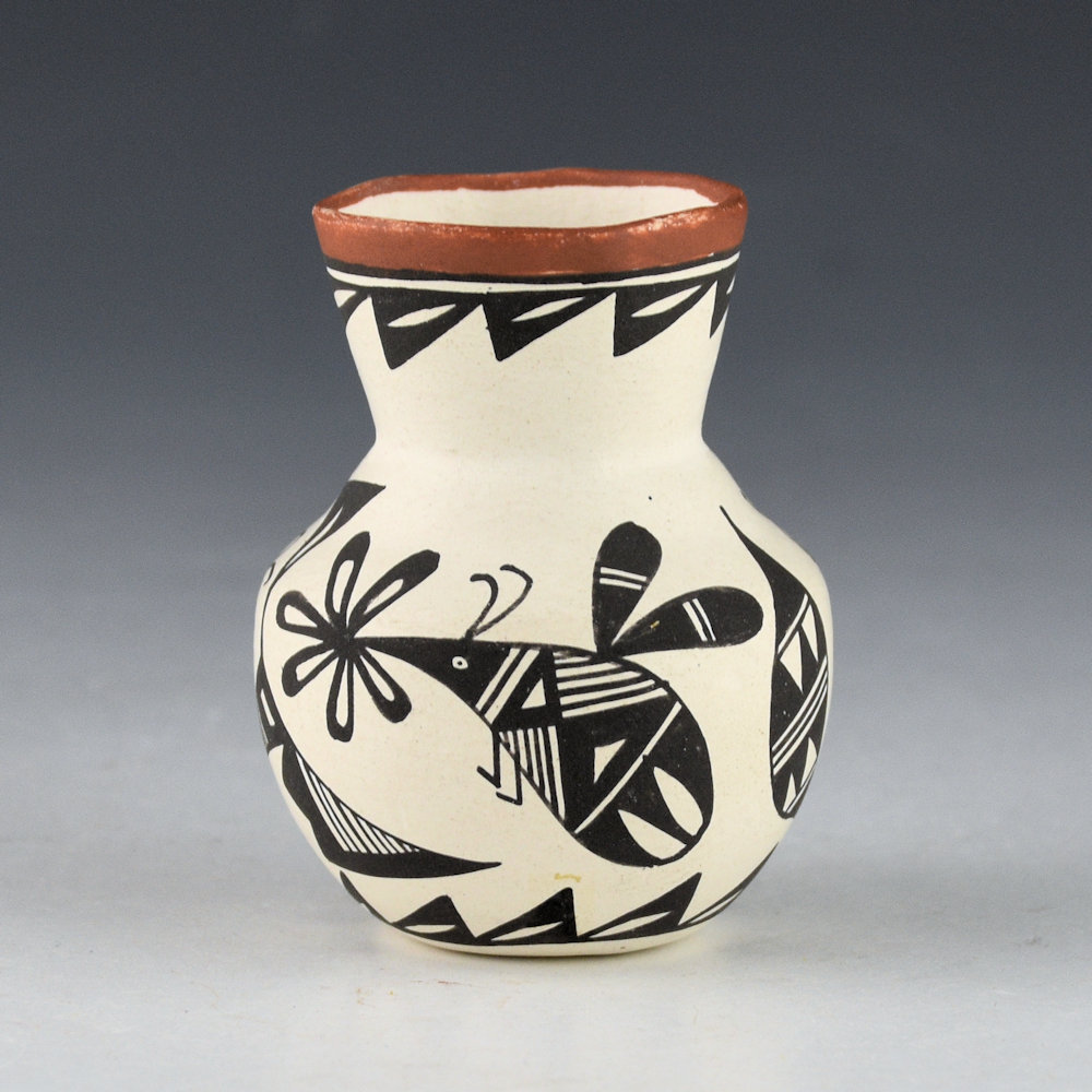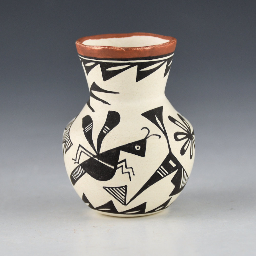 Diane Lewis-Garcia is known for her tightly painted miniature pottery. This is an intricately designed water jar. The jar has a red rim and on the sides are a Mimbres bee, quail, and grasshopper. There are additional cloud and rain designs. It is signed on the bottom, “D. Lewis”.