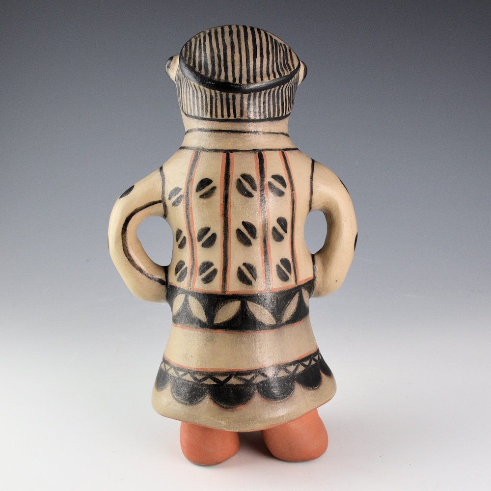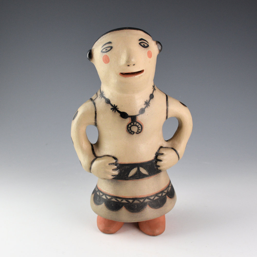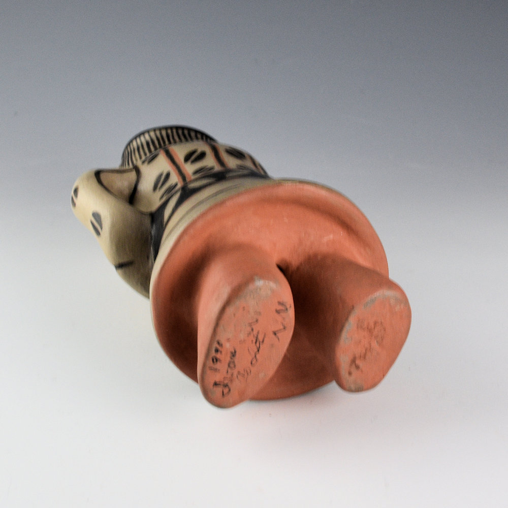 Ivan Lewis was a son of noted potter Lucy M. Lewis of Acoma Pueblo. He was married to Rita Banada Lewis of Cochiti Pueblo. Together they started making bowls and animal figurines around 1971 and storyteller figurines around 1973. Ivan learned to make pottery from Rita, so all his work was done in a Cochiti style. It was not until around the 1980s that he began to make figures. This is a female monos figure. The Monos figures were originally made in Cochiti Pueblo beginning in the 1880s and were often made as social commentary. This figure has a painted squash blossom necklace and classic pottery designs on her dress. It is slipped white and painted with wild spinach (black). The figure was traditionally fired. It is signed, “Ivan Lewis” on the bottom. It is in excellent condition with no chips, cracks, restoration, or repair.