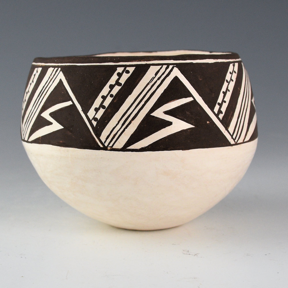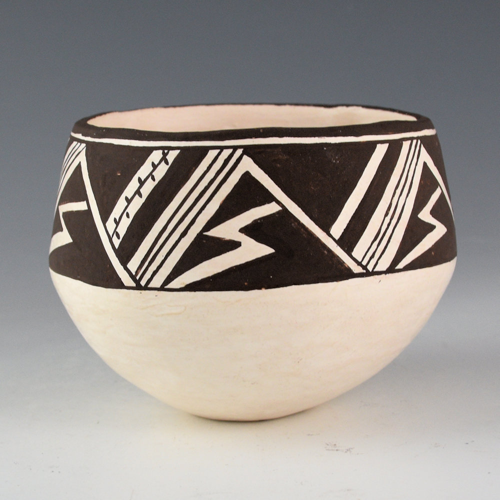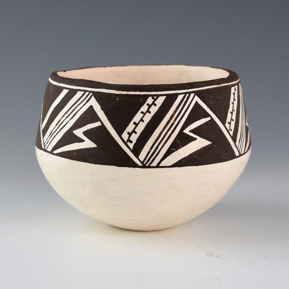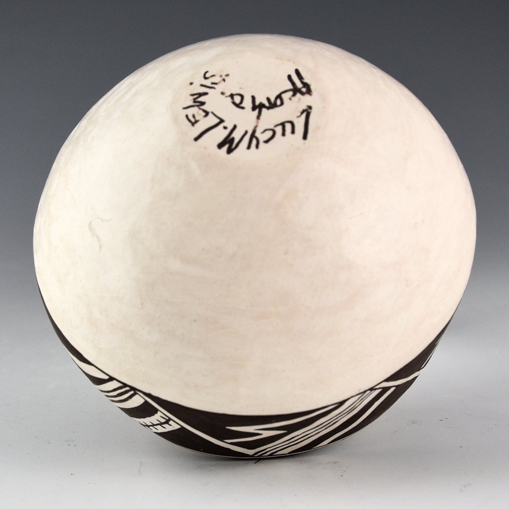 Lucy Lewis is one of the great Matriarch potters of the past century. This jar is from the 1980s. It is a very traditional Acoma design. The piece has mountains and lightning designs. They are repeated across the surface of the bowl. It is signed on the bottom, “Lucy M. Lewis”. It is in very good condition with no cracks, restoration, or repair.