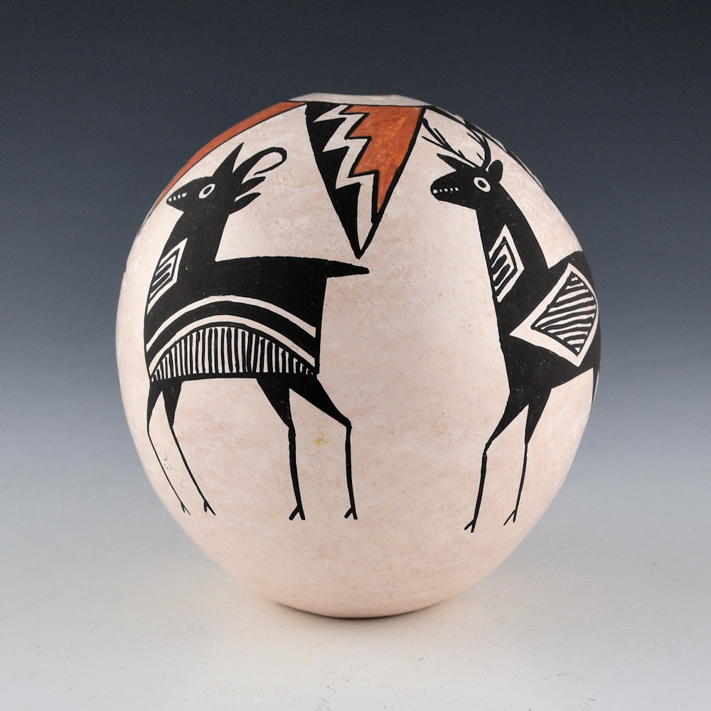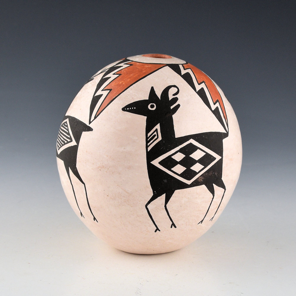 Lucy M. Lewis is among the best-known Acoma potters for her pottery revival beginning in the 1950s. This seedpot is a larger size and the top has a star pattern. On the sides are four large Mimbres animals. There are two deer and two antelopes. The deer have the same fine-line designs in their bodies, while each antelope is different. The piece is coil-built and painted with bee-weed and red clays. The seedpot is signed on the bottom “Lucy M. Lewis”. It is in excellent condition with no chips, cracks, restoration, or repair. Certainly one of the classic pieces by this important matriarchal potter!