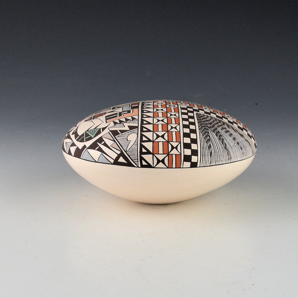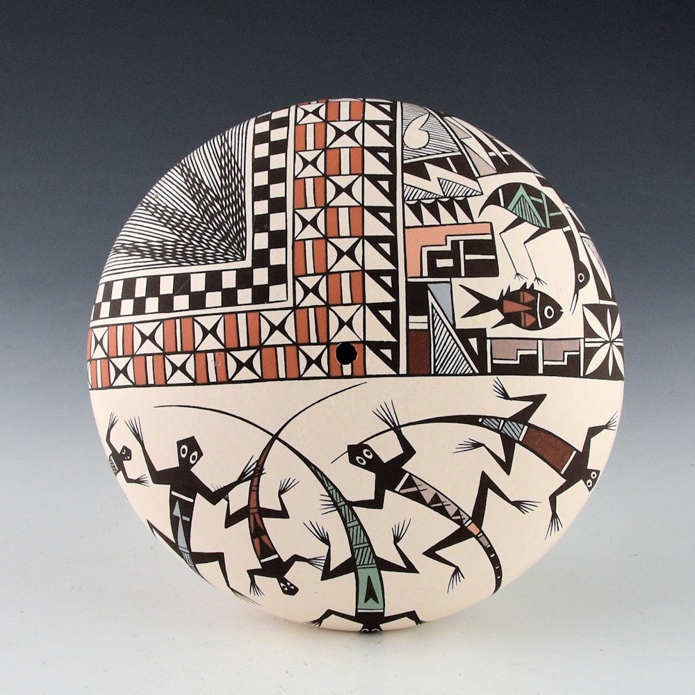 Sharon Lewis has developed her own very distinctive style of painted design.  Her pieces are beautifully formed, thin-walled, and then tightly painted.  This large seedpot has five Mimbres lizards on one half. The other half has a Mimbres bird and fish along with geometric designs.  There are classic fine-line, snow, and bird wing patterns as well.  It is a very complex piece.   The black is from bee-weed, and the coloration is from various clay slips.  The seedpot is signed on the bottom, “S.  Lewis”.