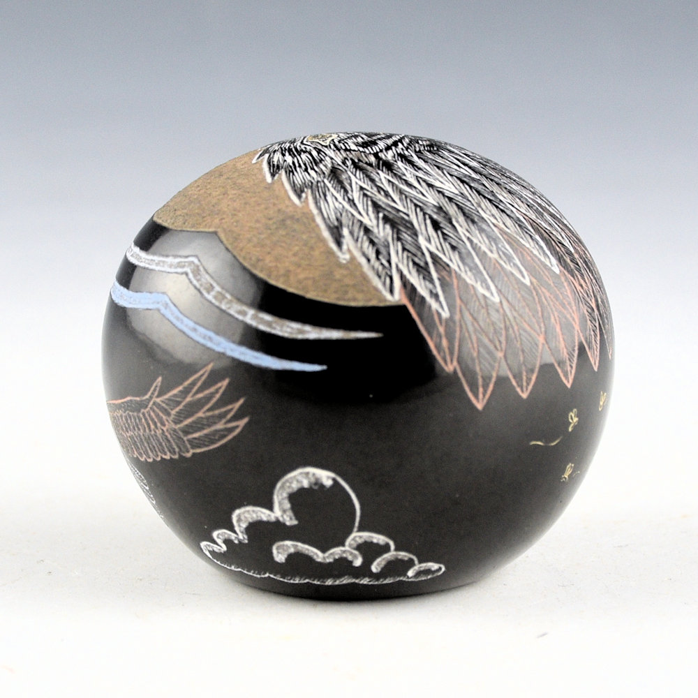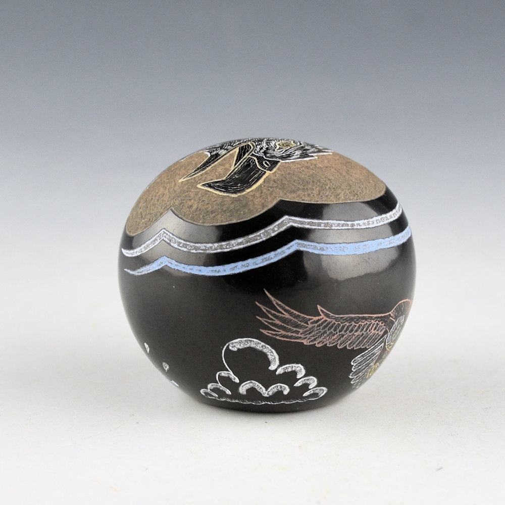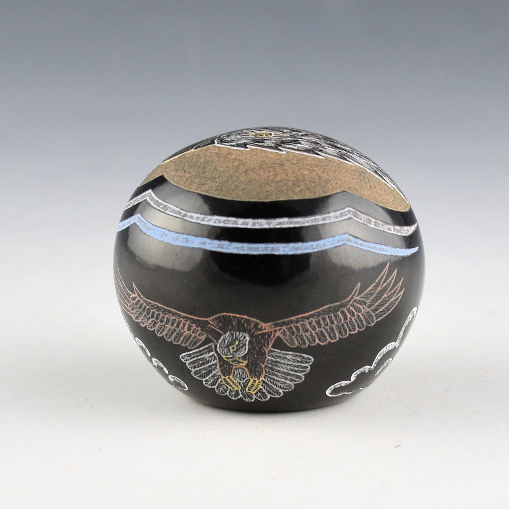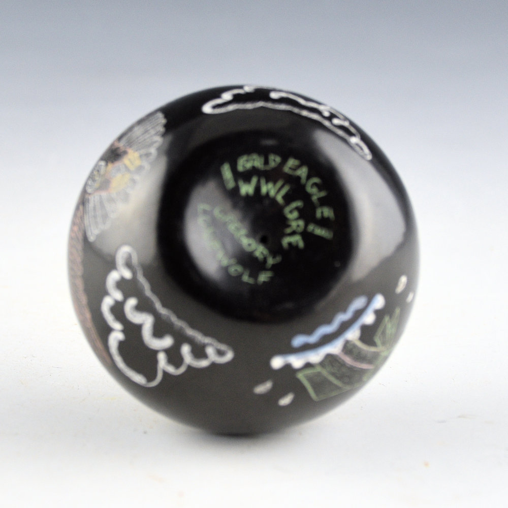 Greg Lonewolf is the son of Joseph Lonewolf and is known for his intricately incised miniatures. This seedpot is one of his few black fired pieces. The piece is entitled, “Bald Eagle”. There is a realistic Bald Eagle on the top. Behind the eagle are round designs. The back of the piece has a realistic eagle in flight along with a fish and clouds. All the various colors are additional clay slips. which are added after the black firing. It is signed on the bottom, “Gregory Lonewolf”. It is in excellent condition with no chips, cracks, restoration or repair.
